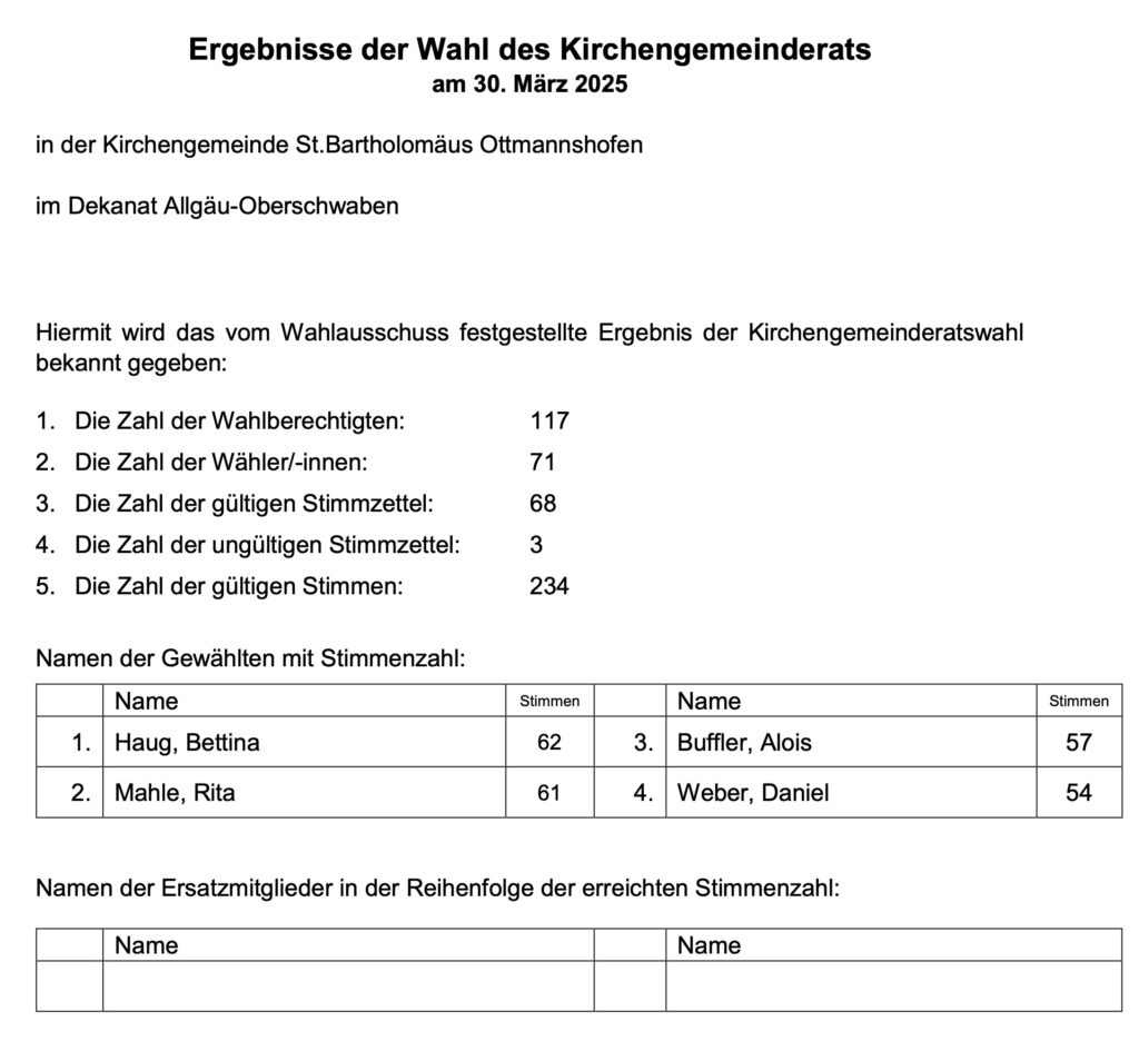 In Ottmannshofen gingen 60,7 Prozent der 117 Wahlberechtigten zur Wahl. Das beste Ergebnis hatte Bettina Haug.