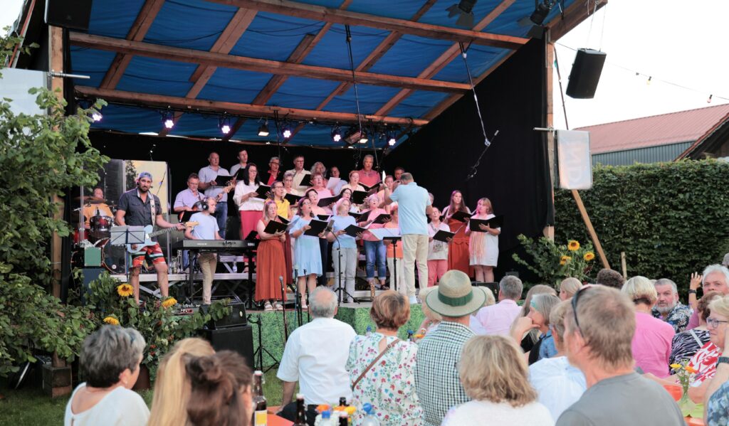 „Unglaublich“, „besser geht’s nicht“, „grandios“ – das sind nur einige der vielen Besucher-Kommentare. Und tatsächlich, es passte einfach alles: die laue Sommernacht, die musikalischen Highlights und die atemberaubende Kulisse. Mit professioneller Bühne samt Licht- und Tontechnik, sowie mit einem bunten Lichtermeer und aufwändiger Dekoration hatten die Kirchenchor-Mitglieder den weitläufigen Garten der Familie Hiemer in ein stimmungsvolles Open-Air-Gelände mit Festival-Flair verwandelt. Chapeau! – das verdient ein extra Lob, allen voran an Technik-Chef Maximilian Hiemer. Die besondere Atmosphäre und die beeindruckende Mischung aus Rock- und Popklassikern, perfekt arrangiert und launig moderiert von Chorleiter Berthold Hiemer und hervorragend präsentiert vom Kirchenchor mit Band, begeisterten das Publikum. Mal lautstark, mal verträumt, sangen die Gäste bei den bekannten Hits von Chicago, Coldplay, Toto, Queen oder Bryan Adams mit. Neben dem eindrucksvollen Chorklang, der keine Wünsche offen ließ, glänzte vor allem die 4-köpfige Band mit Klaus Schönmetzler (Schlagzeug), Ronnie Haug (E-Gitarre), Christoph Heidel (E-Bass) und Maximilian Hiemer (Keyboard, Ton-Technik, Arrangements). Für Abwechslung sorgten ausdrucksstarke Solopassagen, wie beispielsweise bei „Run“ von Leona Lewis (Patricia Wagner und Tatjana Göppel) und –– wie bei Tubthumping –– das Trompetensolo von Berthold Hiemer und Claudia Schönmetzler. Die visuellen Highlights setzte Lichtspezialist Josef Steinhauser und Elmar Kloos sorgte für einen professionellen Sound.