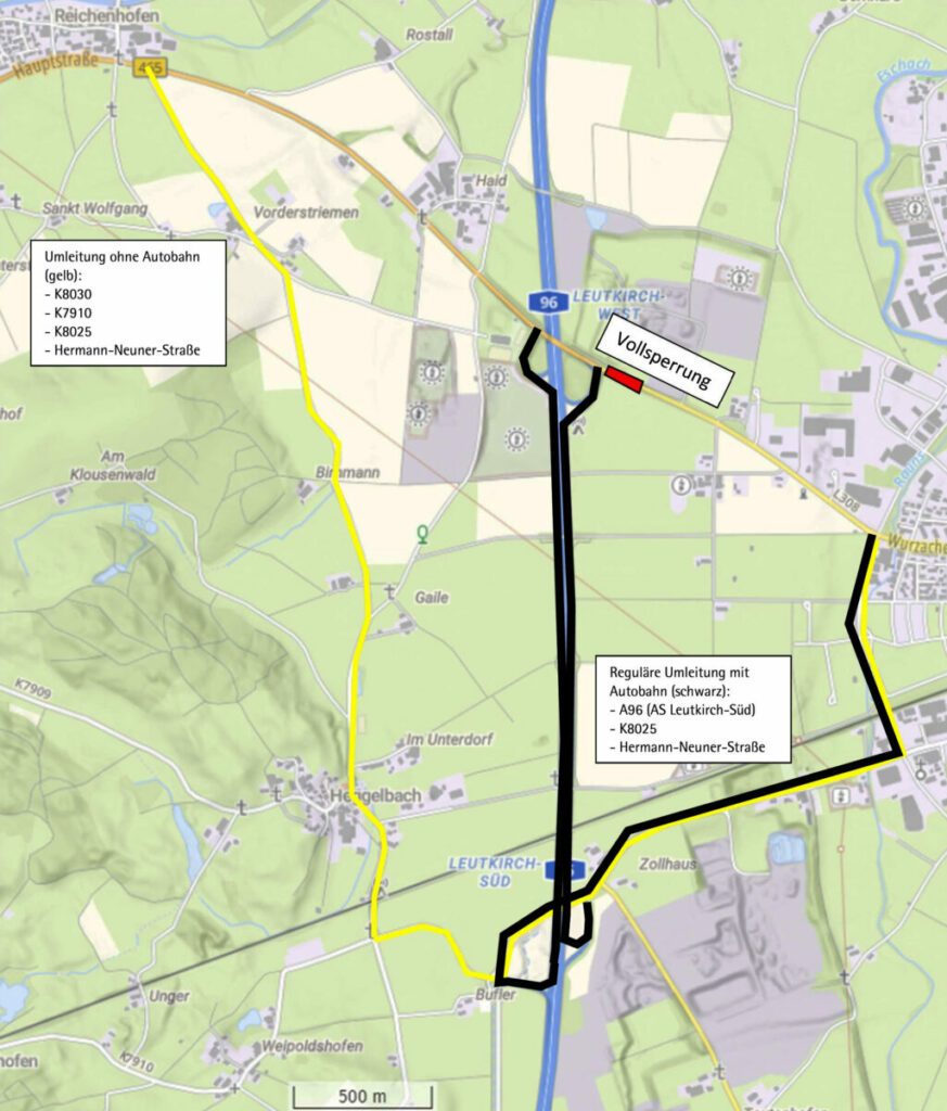 Während der Sperrung werden Umleitungen eingerichtet. Diese führen zum einen über die A96 (Anschlusstelle Leutkirch Süd), die K 8025, die Wangener Straße und die Hermann-Neuner-Straße und umgekehrt. Oder alternativ – ohne Autobahn – über die K 8030, Heggelbach, K 7910, K 8025, Wangener Straße, Hermann-Neuner-Straße und umgekehrt. Siehe nachstehend abgebildete Karte.