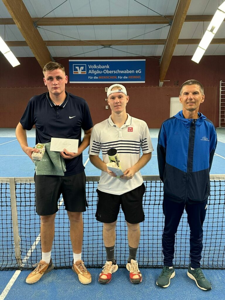Die Erst-und Zweitplatzierten der Tennis-Stadtmeisterschaft 2024 Herren A: Johannes Krohmer und Colin Klein, rechts Turnierleiter Jürgen Bärtle. Foto: TCL