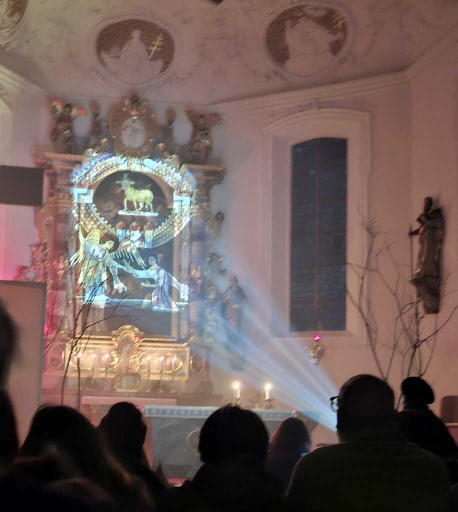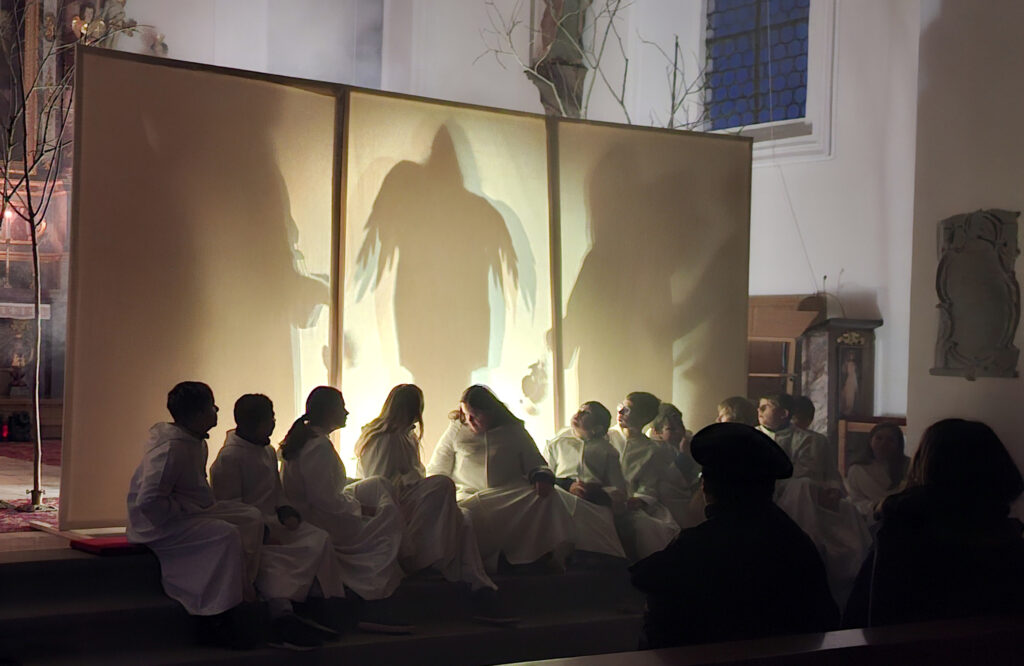 Dann ist es still, der Kirchenraum in geheimnisvolle Dunkelheit gehüllt. Bis sich vom Eingang her eine Lichterprozession in Bewegung setzt. Ministrantinnen und Ministranten schreiten mit ihren Kerzen langsam nach vorn und lagern sich auf den Stufen zum Chorraum, der durch eine dreiteilige Stellwand vom Kirchenraum abgetrennt ist. Sie löschen ihre Lichter, ein Schattenspiel beginnt: Zwei schwingende Weihrauchfässer verteilen ihren würzigen Duft, Rauch steigt auf, der Umriss einer Schattengestalt wird sichtbar – ein Engel? Alles scheint möglich. Die Kinder und Jugendlichen in ihren weißen Gewändern symbolisieren das Gottesvolk, das sich nach Erlösung sehnt und auf den Retter wartet. Die Wand symbolisiert die Trennung der irdischen von der göttlichen Sphäre.