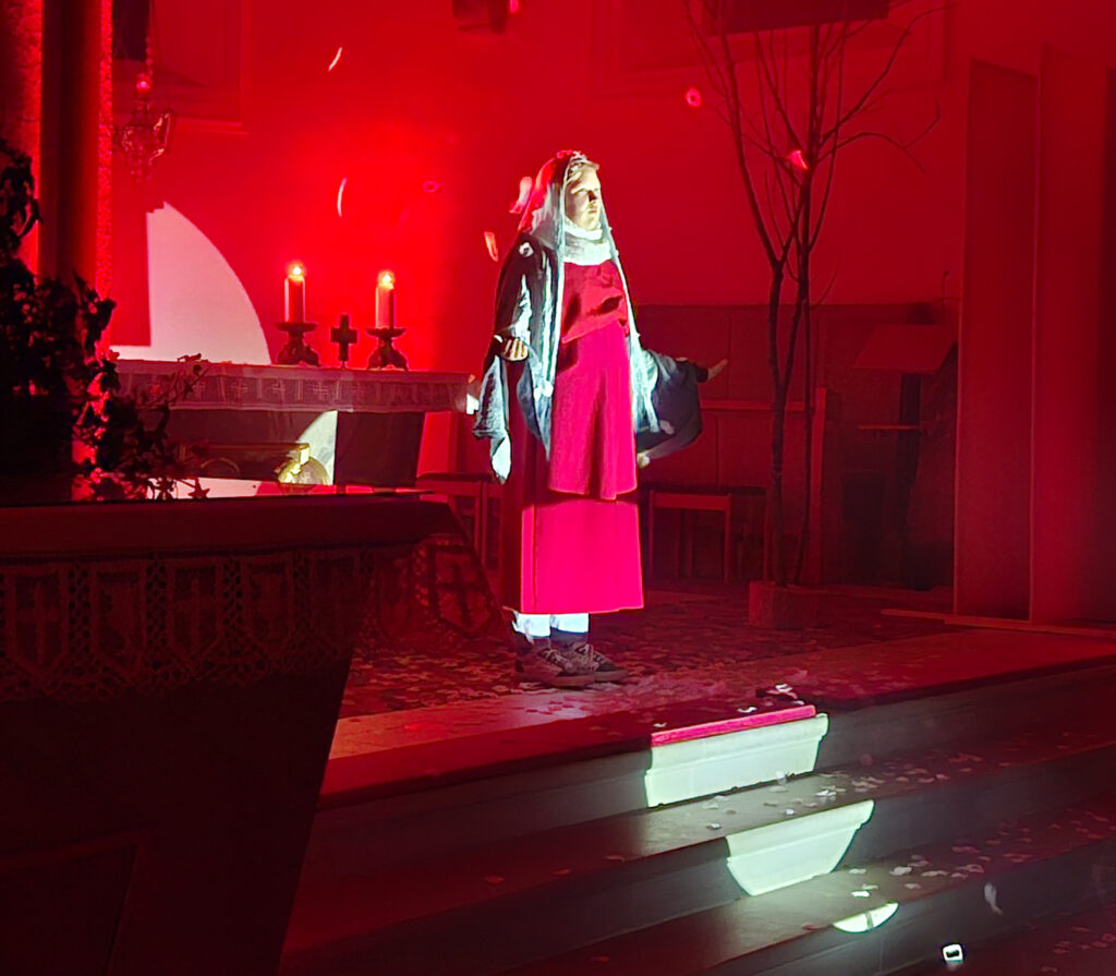 Ganz in warme Rot-und Lilatöne getaucht ist der Chorraum beim vierten Teil der Performance. Der letzte Adventssonntag ist im katholischen Glauben der Figur der Maria als der von Gott auserwählten Mutter des Erlösers gewidmet. Eine Mitwirkende tritt als Maria auf, ganz in Rot und Weiß gekleidet. Erst wandelt sie zaghaft im Hintergrund, schreitet dann aber nach vorn und wirkt plötzlich stark, entschieden, bereit für ihren Auftrag. Rosenblätter schweben von oben auf sie herab. Ein Segen, ein Engelsgruß? Wieder verschwindet die Grenze von göttlicher und irdischer Sphäre.