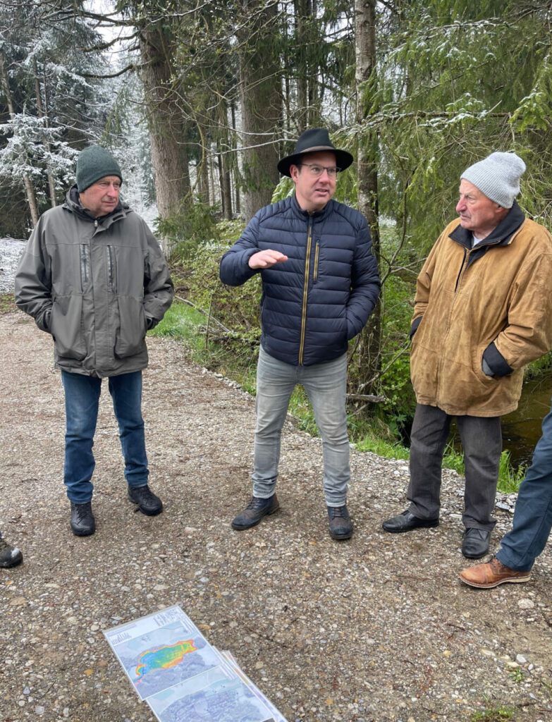 Bei der nächsten Station, beim Blindele-See, beteiligten sich mehrere Grundstückseigentümer und weitere Interessierte an den Gesprächen mit dem Landtagsabgeordneten, dem Ortsvorsteher und der Projektleitung Naturvielfalt Westallgäu, Jan Bolender und Siegfried Kehl (Naturmanagement). Die beiden Fachleute haben es geschafft, seit Beginn des Projekts 2022, mit Informationsveranstaltungen und vielen persönlichen Gesprächen die beteiligten Personen über das geplante Projekt aufzuklären, um die Einzigartigkeit dieser besonderen Flächen zu erhalten. Gutachten zur Tier- und Pflanzenwelt sowie die Ergebnisse hydrologischer Untersuchungen sind Grundlage eines Renaturierungsplans, der die Wiedervernässung der Moorflächen sowie mögliche Konflikte darstellt. Dabei ist bereits jetzt schon abzusehen, dass entsprechende Grundstücksverhandlungen an nicht vorhandenen Ersatzflächen oder am Grundstückspreis scheitern könnten. Auf Anregung von Alois Peter sollten Grundstücke in Schutzgebieten (Moore) neu bewertet werden. „Bisher werden diese Flächen als fast wertlos gehandelt, was so nicht sein kann. Sie tragen durch die Wiedervernässungsmaßnahmen entscheidend zum Klimaschutz und zur Erhaltung der Artenvielfalt bei, das sollte auch was wert sein“, betonte der Ortsvorsteher und darf auf die Unterstützung von Raimund Haser MdL hoffen.