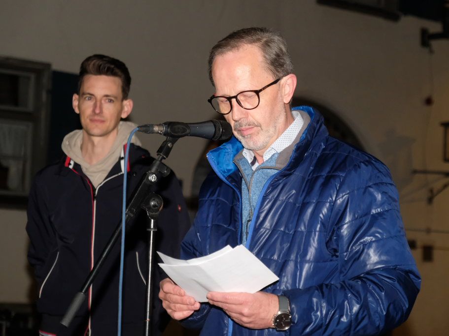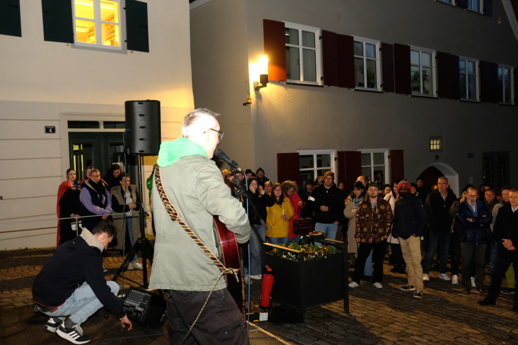 Der Musiker und Musikproduzent Fabian Mroz eröffnete musikalisch die von Philipp Künst moderierte Kundgebung, bei der auch Leutkirchs OB Hans-Jörg Henle zugegen war. Für Thomas Blum, seit drei Jahrzehnten Präsident der Narrenzunft Nibelgau, war es wichtig, dass viele Menschen jetzt aufstehen und Flagge gegen Rechtsextreme zeigen sowie ein wichtiges Zeichen für mehr Toleranz setzen. „Denn Fasnet, Fasching, Karneval sind so vielfältig wie unsere Gesellschaft.“ In seinen Augen ist die AfD eine Gruppe von Rattenfängern, die vor allem Fremdenhass schüren. „Wir lassen unsere achtbare Demokratie von diesen nicht kaputt machen!“