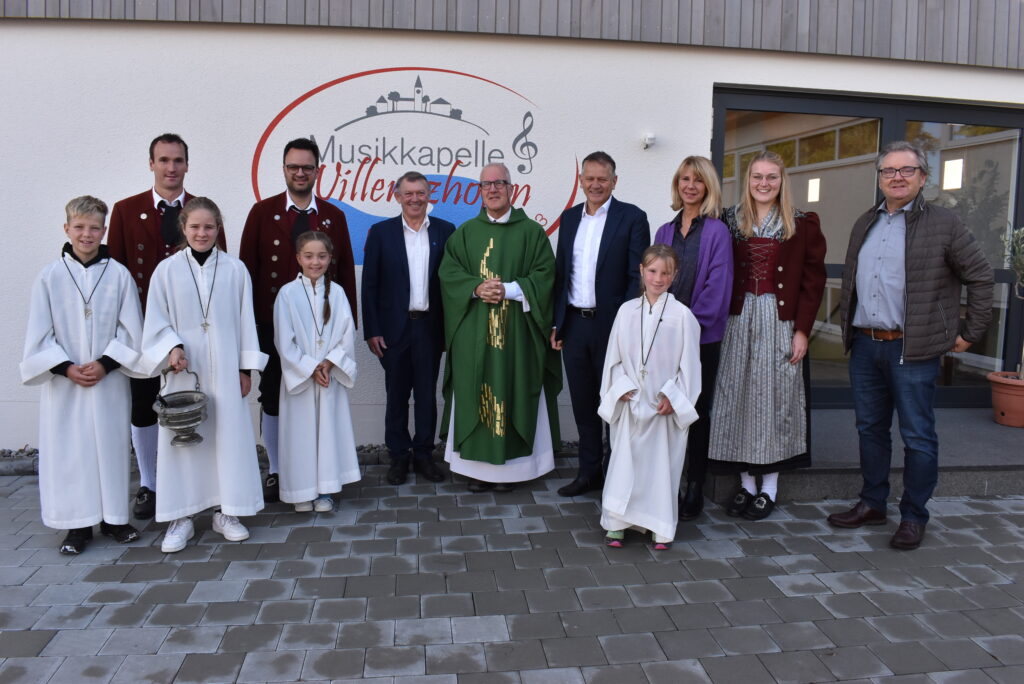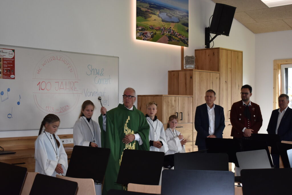 Pfarrer Schneider segnete nach dem Gottesdienst den neuen Proberaum mit Weihwasser und man betete ein Vater unser. Unter den Ehrengästen waren OB Hans-Jörg Henle, Ortsvorsteher Alois Peter, Schulleiterin Daniela Winterstein und Herr Fink von der Schule Willerazhofen, ebenso Ortschaftsräte und Ehrenmitglieder der Musikkapelle (MK).
