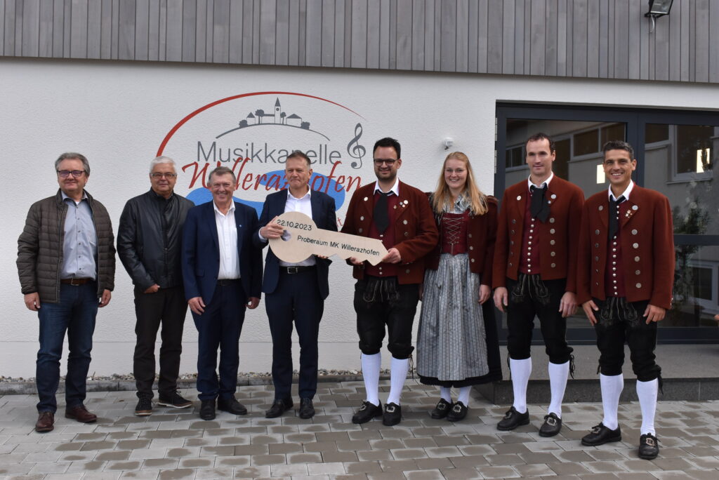 Ein besonderes Dankeschön von der MK Willerazhofen bzw. Vorstand Florian Sauter, ging an die Herren Robert Müller und Musikant Tobias Reutlinger, die beide den Bau fachmännisch begleiteten und immer vor Ort waren. Unglaubliche 2000 freiwillige Stunden reine Eigenleistung stecken in dem Anbau, die Mitglieder der Musikkapelle, Angehörige und Freunde geleistet haben, unzählige Stunden der Vor- und Nachbereitung, der Sitzungen, Telefonate usw. sind hier nicht eingerechnet. Sauter dankte allen herzlich dafür, die tatkräftige Zusammenarbeit habe u.a. auch der Kameradschaft gut getan. Es sei ein Meilenstein in der genau 100-jährigen Geschichte der MK Willerazhofen, ein Jubiläum, das seit dem Frühjahr mit mehreren unterschiedlichen Festen noch bis April 2024 gefeiert wird.