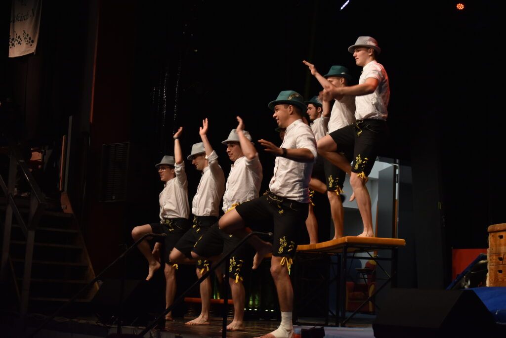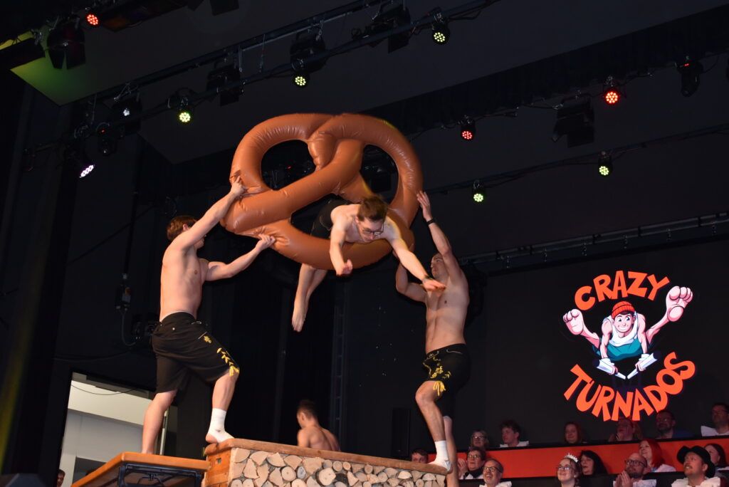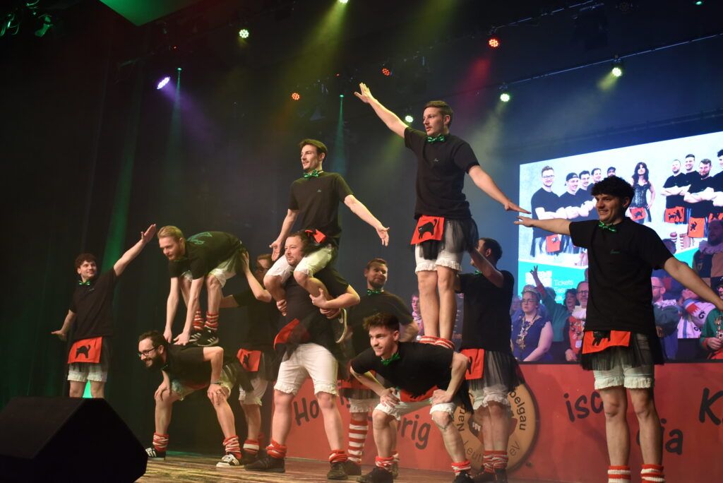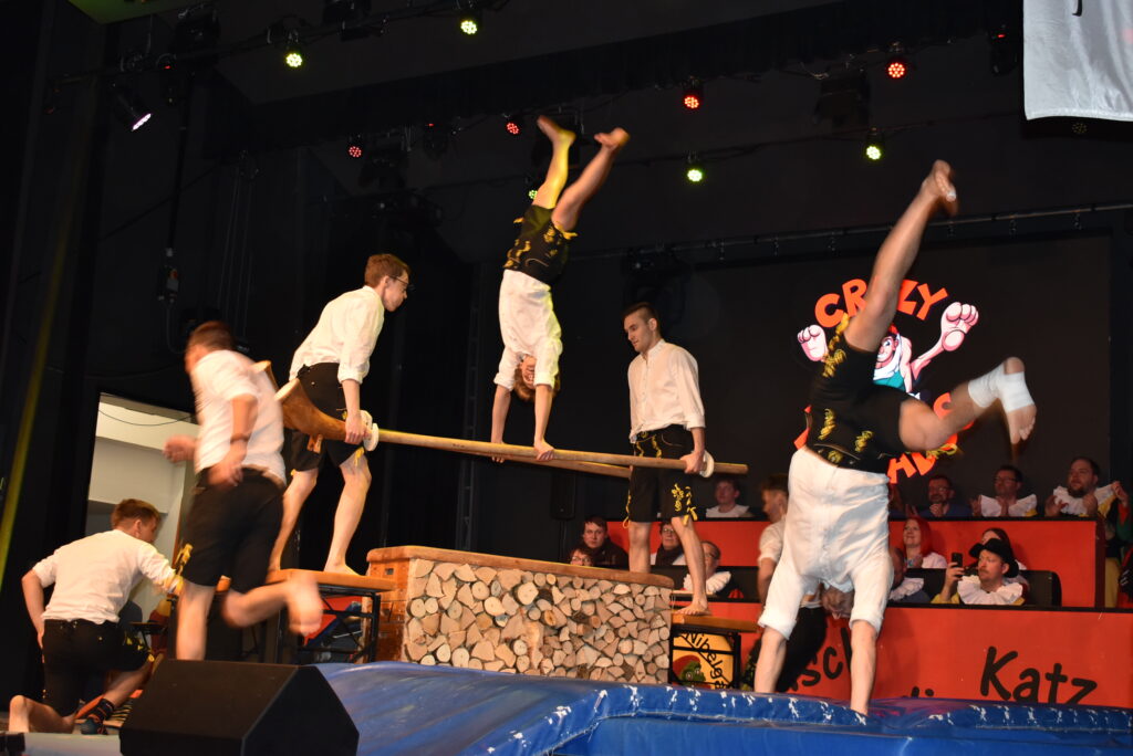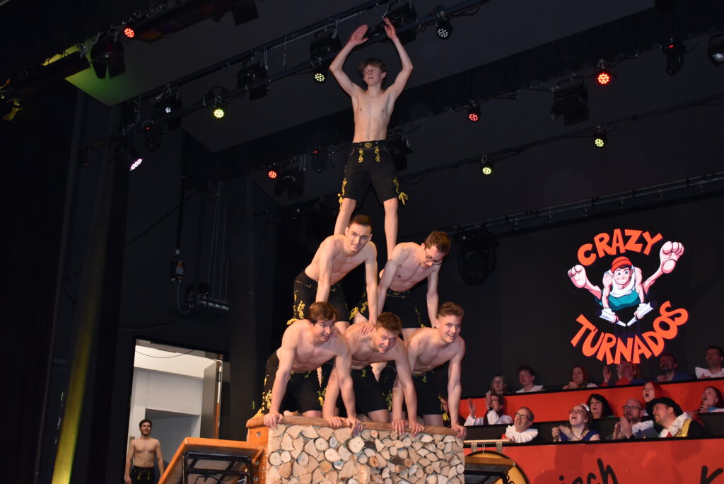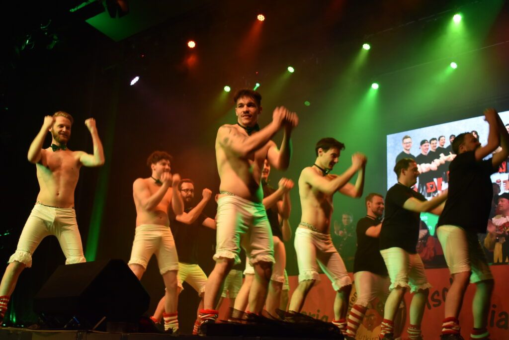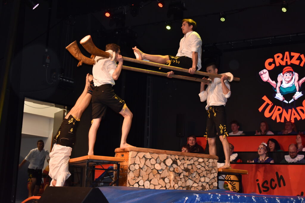 Showtanz von den Profis: Bliems Bunte Bühne aus Ottmannshofen machte ihrem Namen alle Ehre und die Damen als Signoras verkleidet, wirbelten nur so über die Bühne. Eine super einstudierte Choreografie von Gabi Lipp wurde mit viel Applaus bedacht. Die Crazy Turnados, eine Männerturngruppe aus Wiggensbach, zeigte atemberaube Akrobatik mit zahlreichen Überschlägen und Salti. Sie zeigten auch viel Haut, ebenso wie die Männertanzgruppe „Green Boys“, eine Formation der Grünen Hexen Leutkirch. Einstudiert von Vanessa Boos, Sabrina Kolb-Rauseo und Corinna Klützsch, rockten die feschen Jungs übers Parkett und ließen so manche Hülle bis zum String-Tanga fallen.