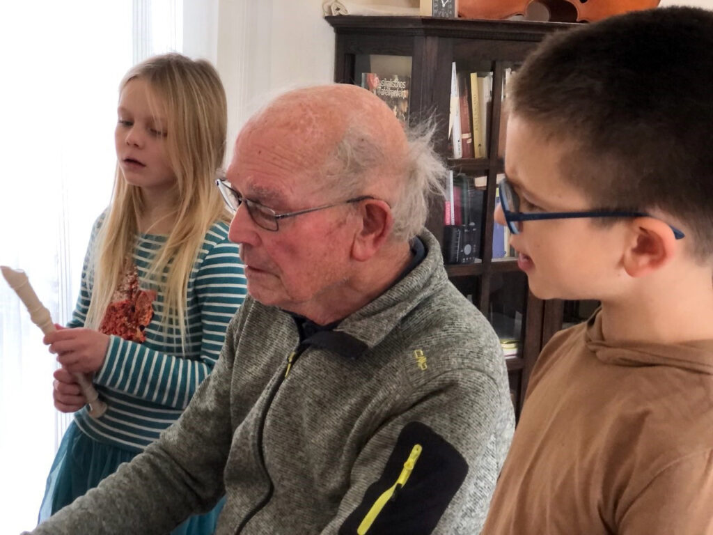 Weihnachtsliedersingen und -spielen mit den größeren Urenkeln (insgesamt haben Albrecht und Eveline Roth sechs Urenkel).