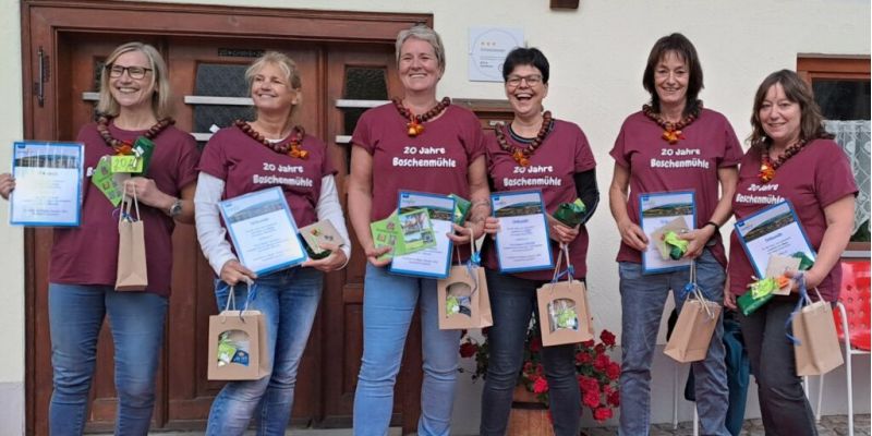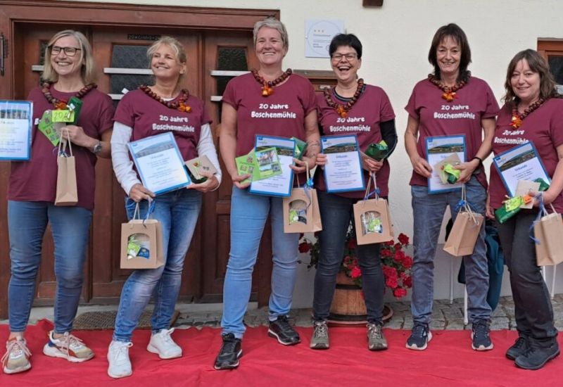 Leutkirch – Sechs Freundinnen aus dem Remstal genießen die malerische Ruhe und familiäre Atmosphäre der Pension Mühlwald in Leutkirch im Allgäu. Anlässlich ihres 20. Aufenthalts wurden die treuen Gäste von Familie Albrecht und der Touristinfo Leutkirch mit einem roten Teppich und besonderen Geschenken überrascht.