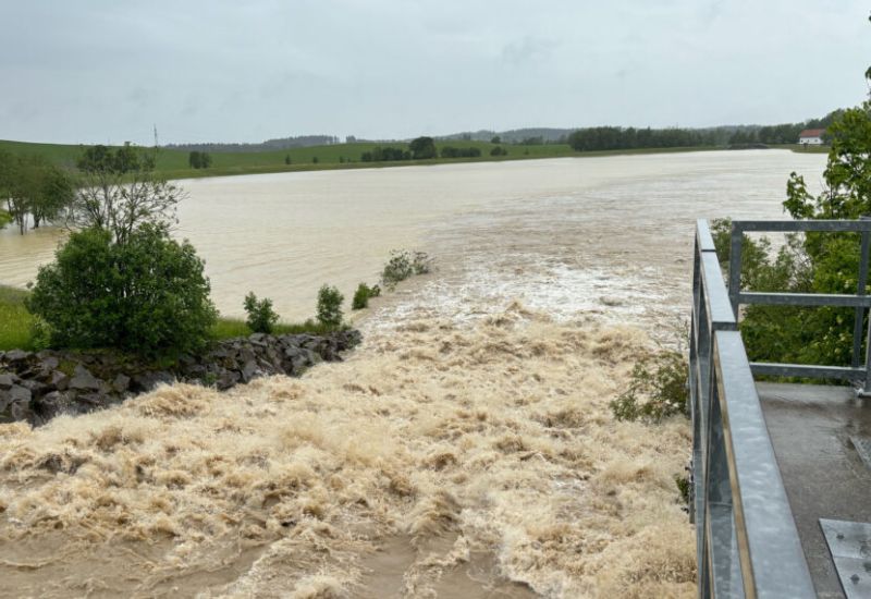 Leutkirch (rei) – Die hier veröffentlichten Fotos vom Hochwasser in Leutkirch wurden am 1. Juni ab 11.15 Uhr gemacht. Sie stammen von Simon Sauterleute. Um ca. 13.00 Uhr schrieb Oberbürgermeister Hansjörg Henle auf Instagram: „Das Rückhaltebecken in Urlau ist seit ca. 3 Stunden voll und entwässert in das Taufach-Fetzach-Moos. Aktuell gibt es keine Angaben, wieviel Wasser das Moos aufnehmen kann, da es durch den monatelangen Regen ebenfalls „gut mit Wasser versorgt wurde“.“ Das Tor zum Rückhalte…