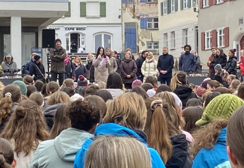 Leutkirch – Freitag, 8. März. 10.00 bis etwa 10.20 Uhr am Kornhausplatz Leutkirch. Internationaler Frauentag. Und hier: „One Billion Rising“. Das heißt: die Erhebung von einer Milliarde Frauen. Nach Angaben von Maria Hönig („Demokratie leben!“, Leutkirch) versammelten sich an diesem Vormittag rund 500 Schülerinnen und auch Schüler zum Tanz gegen Gewalt gegen Frauen am Kornhaus. Dazu gesellten sich rund 70 Schaulustige. Weiter geht’s heute (8.3.) ab 18.00 Uhr mit einer Girls-Party“ im Jugendhaus…