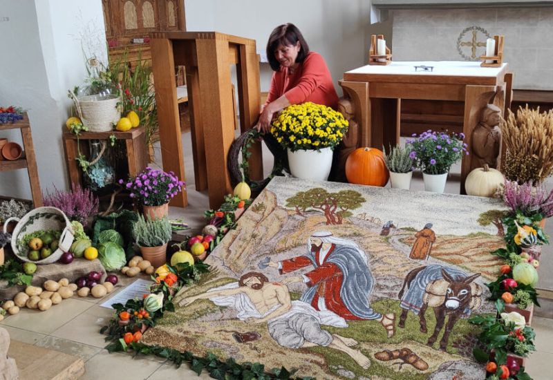 Tautenhofen – Seit 1997 gestaltet Christine Kimmerle jedes Jahr zum Erntedankfest ein Körner- und Samenbild für die Kapelle St. Silvester in Tautenhofen. Mehr als 100 Stunden investiert die Tautenhoferin, damit alle Details sehr akkurat zur Ansicht kommen. Das Bild wird dieses Jahr bis 8. Oktober in der Kapelle zu sehen sein und danach wieder für zwei Wochen in der Galluskapelle oben auf dem Winterberg ausgestellt sein.