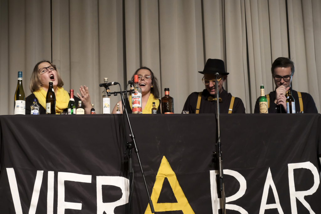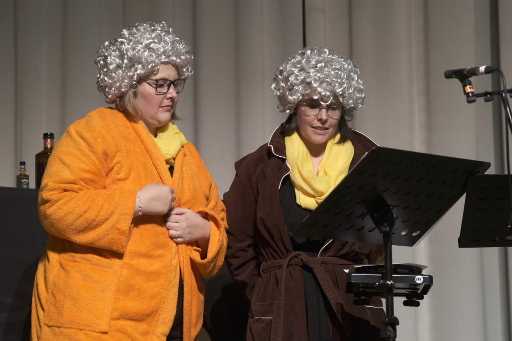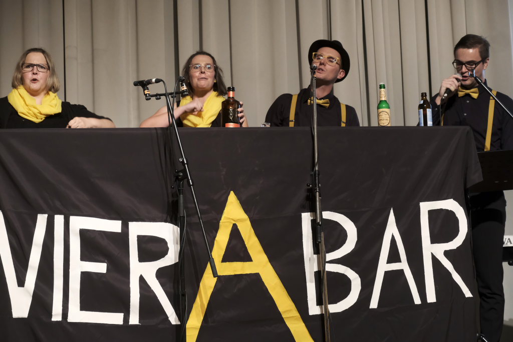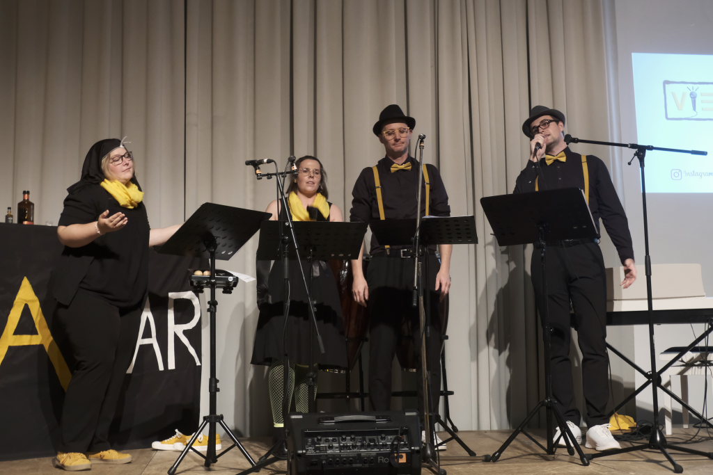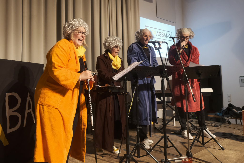 Feierlich kehrten sie dann mit „Laudate“ und Kerzenlicht zurück, wobei sie den Litanei-Text leicht modifizierten. Um dann auf der Bühne rasch den Habit abzulegen und mit „Don´t stop me now“ gleich wieder richtig zur Sache zu kommen. An der Vierabar ließen sie dann Johannes´ Junggesellenabschied noch einmal aufleben. Von dort ging es dann rasch durch die Lebensjahrzehnte mit dem Udo-Jürgens-Klassiker „Mit 66 Jahren“. Ebenfalls schon zum Chorgesang-Klassiker geworden ist das Stück „ Mir im Süden“ der A-Cappella-Gruppe Füenf. Zu einer Ode an Susi Müller wurde das Ramalang-Dingdong, das Anthony als Solist bestritt. Mit dem eher ruhigen „Weit, weit weg“ wollte sich der Vieragsang danach von der Bühne verabschieden, was aber stehende Ovationen des begeisterten Publikums und Lisa Burger und Monika Schmid vom Führungsteam des Frauenbundes zu verhindern wussten. Letztere, weil sie den Sängerinnen und Sängern noch gerne ein Mittel gegen ihren kratzenden Hals zukommen lassen wollten. Und das Publikum weil es noch lange nicht genug gehört hatte.