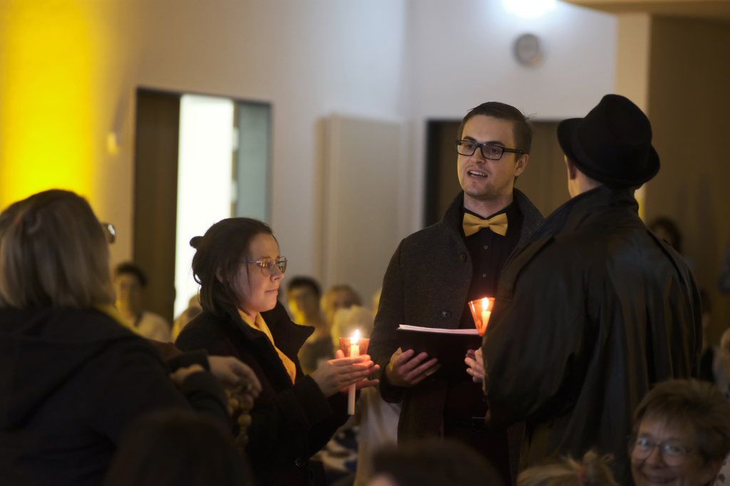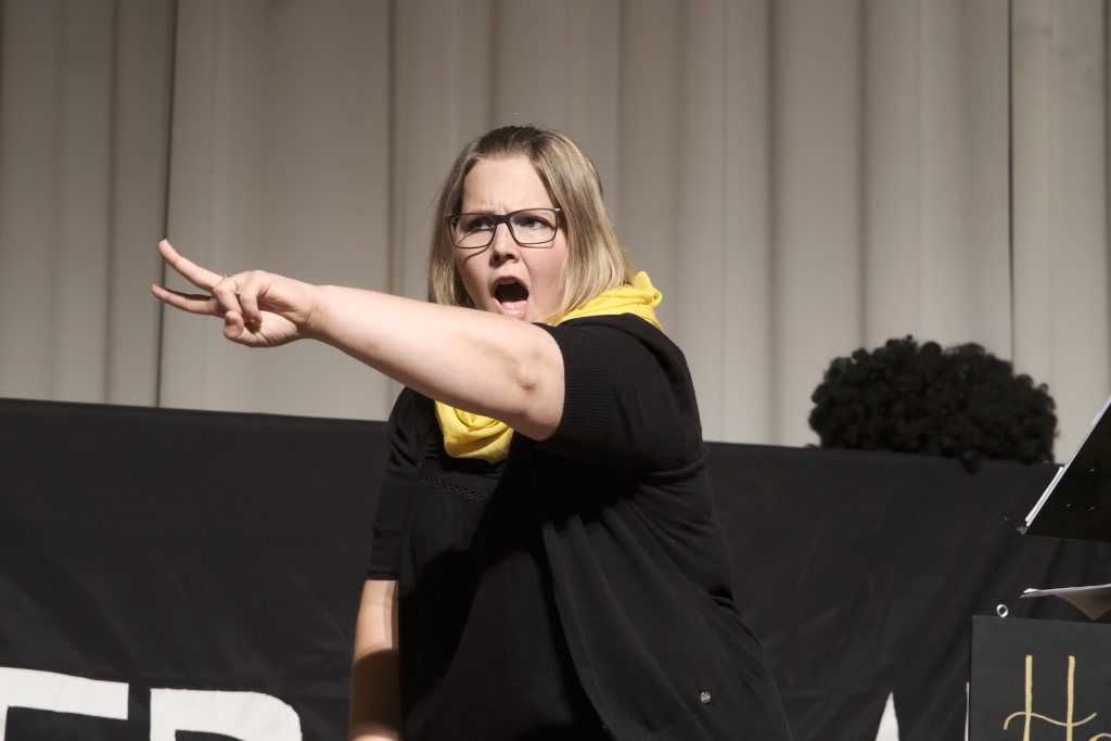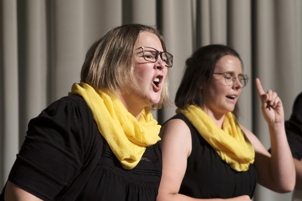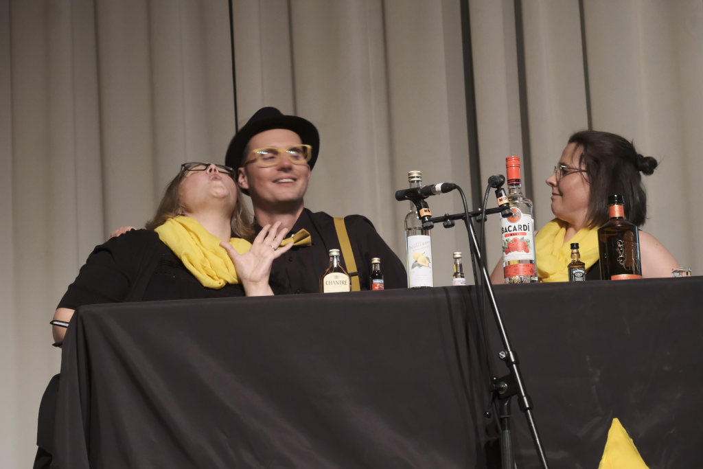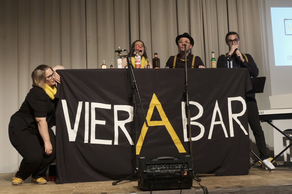 Feierlich kehrten sie dann mit „Laudate“ und Kerzenlicht zurück, wobei sie den Litanei-Text leicht modifizierten. Um dann auf der Bühne rasch den Habit abzulegen und mit „Don´t stop me now“ gleich wieder richtig zur Sache zu kommen. An der Vierabar ließen sie dann Johannes´ Junggesellenabschied noch einmal aufleben. Von dort ging es dann rasch durch die Lebensjahrzehnte mit dem Udo-Jürgens-Klassiker „Mit 66 Jahren“. Ebenfalls schon zum Chorgesang-Klassiker geworden ist das Stück „ Mir im Süden“ der A-Cappella-Gruppe Füenf. Zu einer Ode an Susi Müller wurde das Ramalang-Dingdong, das Anthony als Solist bestritt. Mit dem eher ruhigen „Weit, weit weg“ wollte sich der Vieragsang danach von der Bühne verabschieden, was aber stehende Ovationen des begeisterten Publikums und Lisa Burger und Monika Schmid vom Führungsteam des Frauenbundes zu verhindern wussten. Letztere, weil sie den Sängerinnen und Sängern noch gerne ein Mittel gegen ihren kratzenden Hals zukommen lassen wollten. Und das Publikum weil es noch lange nicht genug gehört hatte.