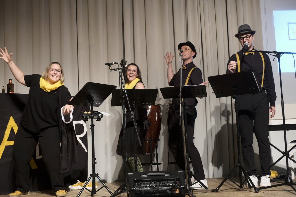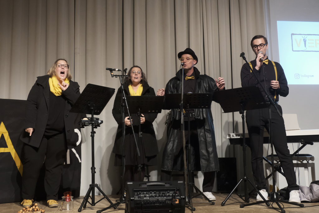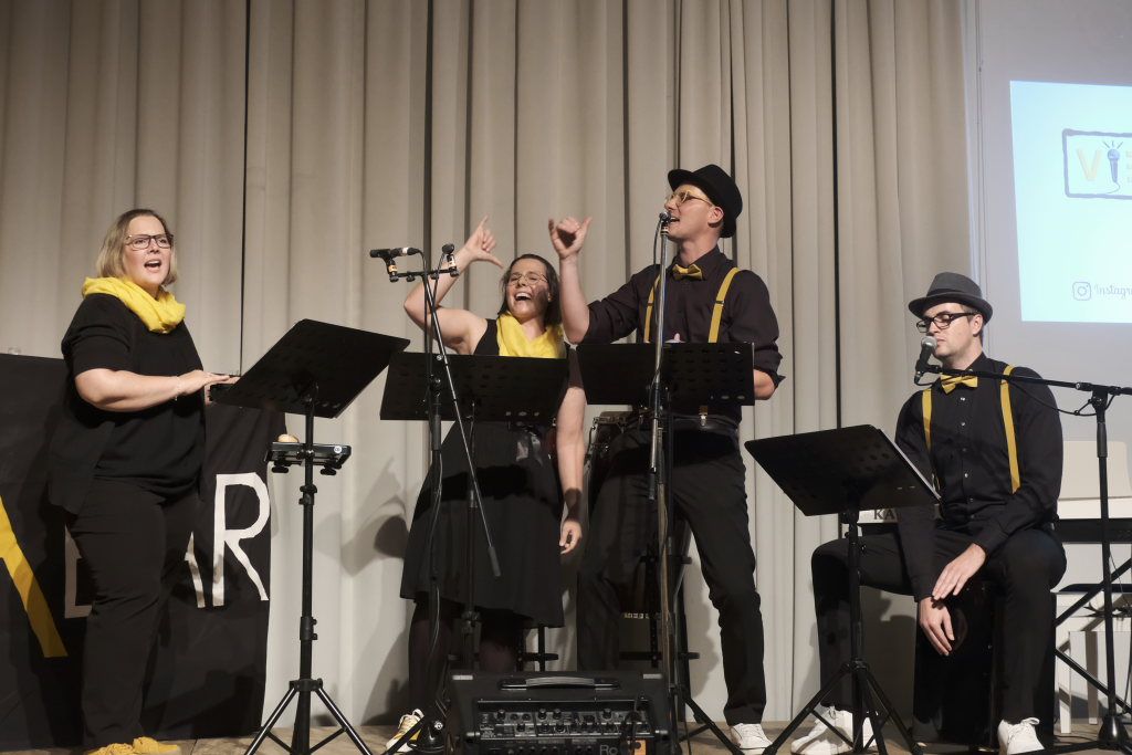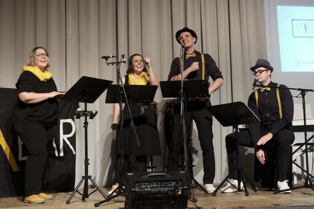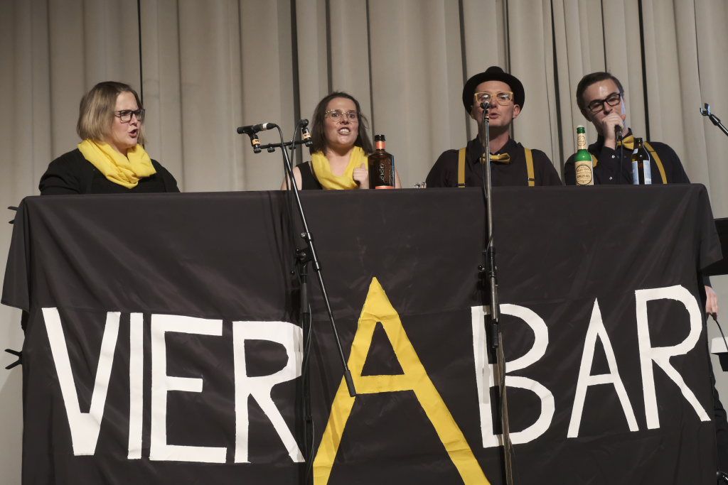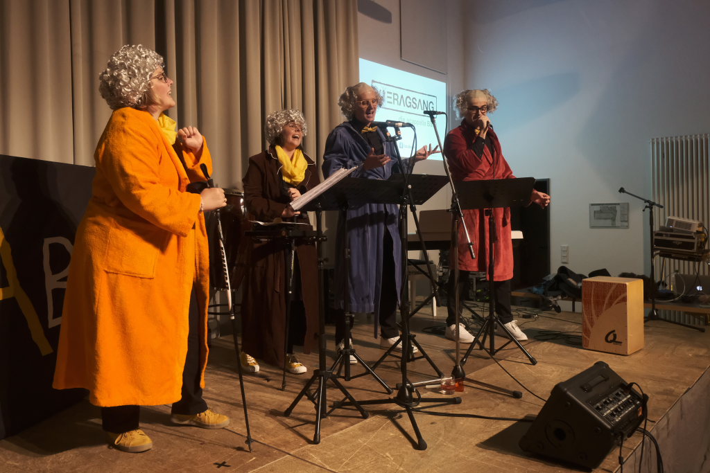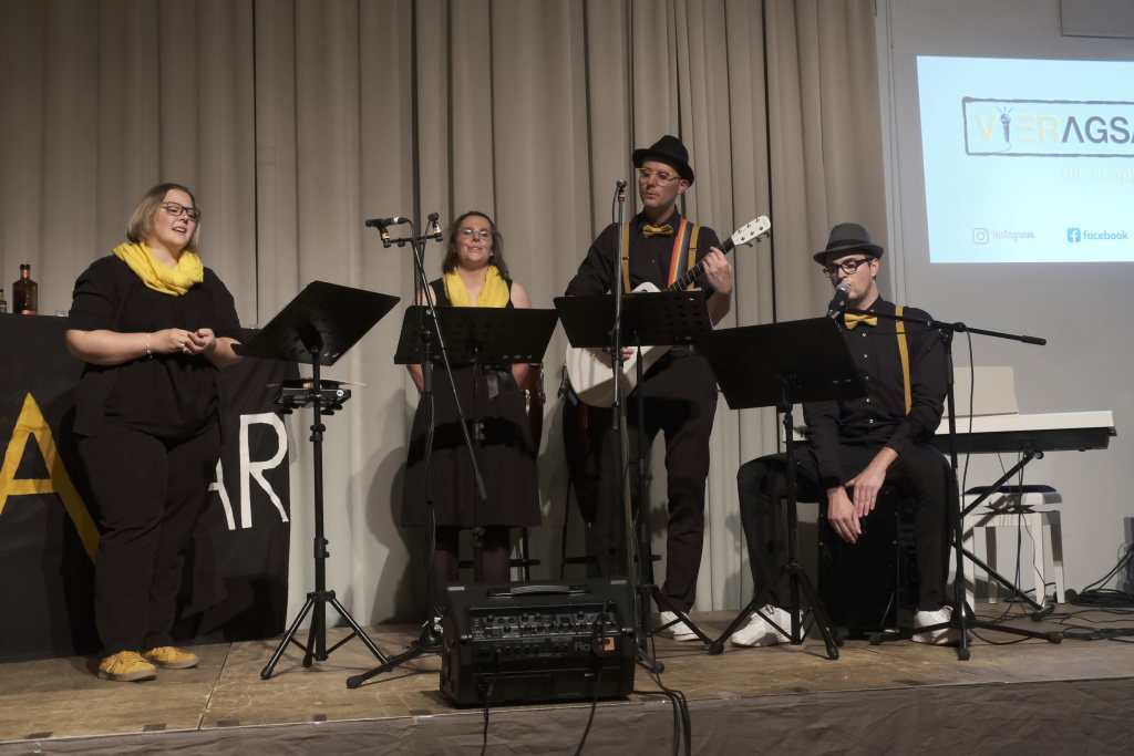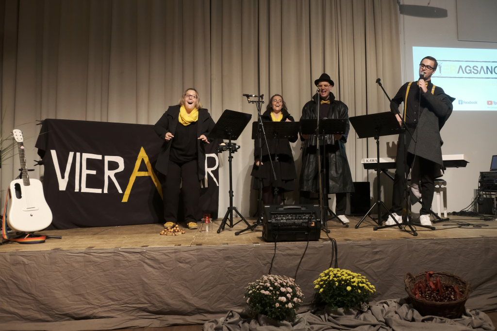 Und so stiegen die Vier mit einem Werbesong-Medley, an dessen Ende sie gleich noch ein Erinnerungs-Selfie anhingen, in ihr Abenteuer ein. Aus dem Hit der Toten-Hosen „Altes Fieber“ wurde bei Vieragsang mit feinsinnigem schwäbischem Humor das Lied der schmerzenden Glieder. Wo ihre musikalischen Wurzeln liegen, zeigten sie bei dem afrikanischen Gospel Mamaliye, begleitet von Klaus Bendel am Cajon. Ihren wunderbaren Humor präsentierten sie dann auch bei ihrer philosophischen Betrachtung darüber, warum englische Titel soviel erfolgreicher sind als deutsche.