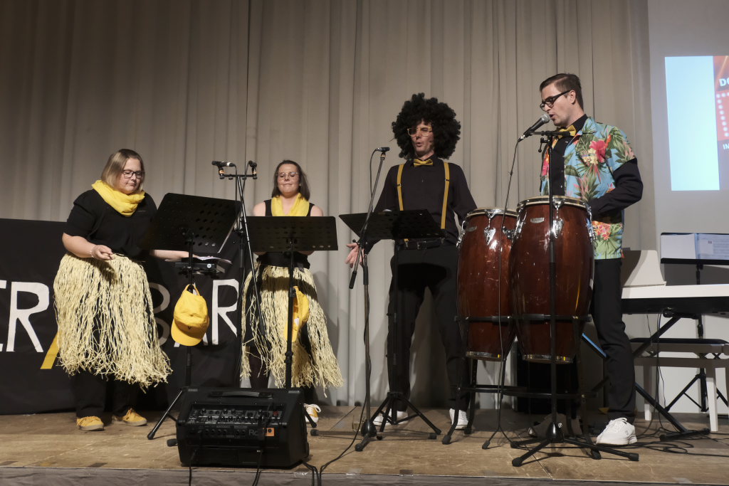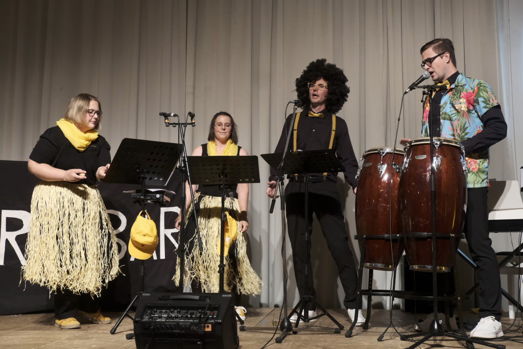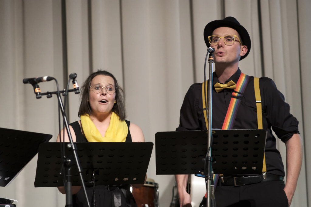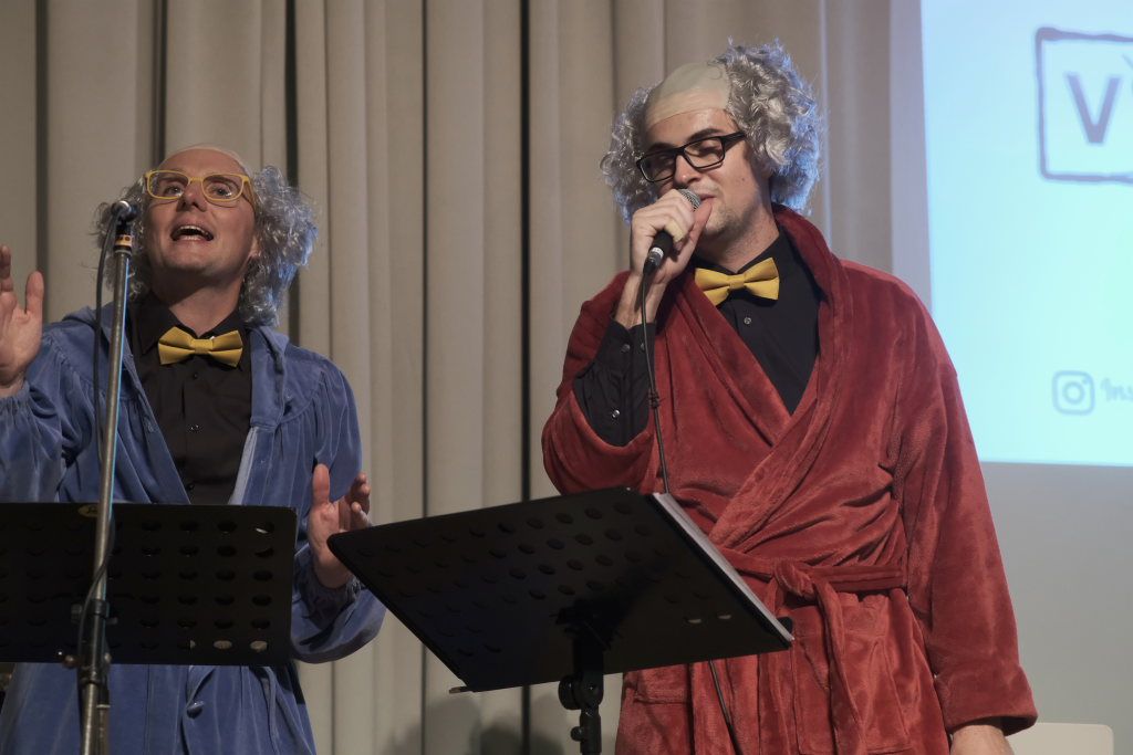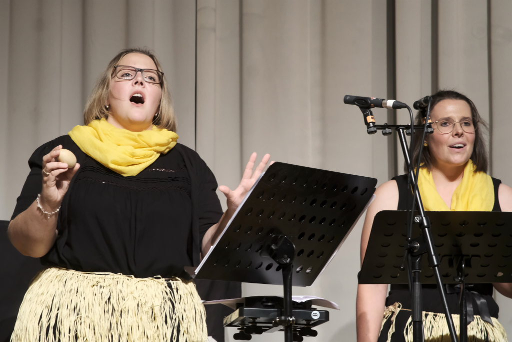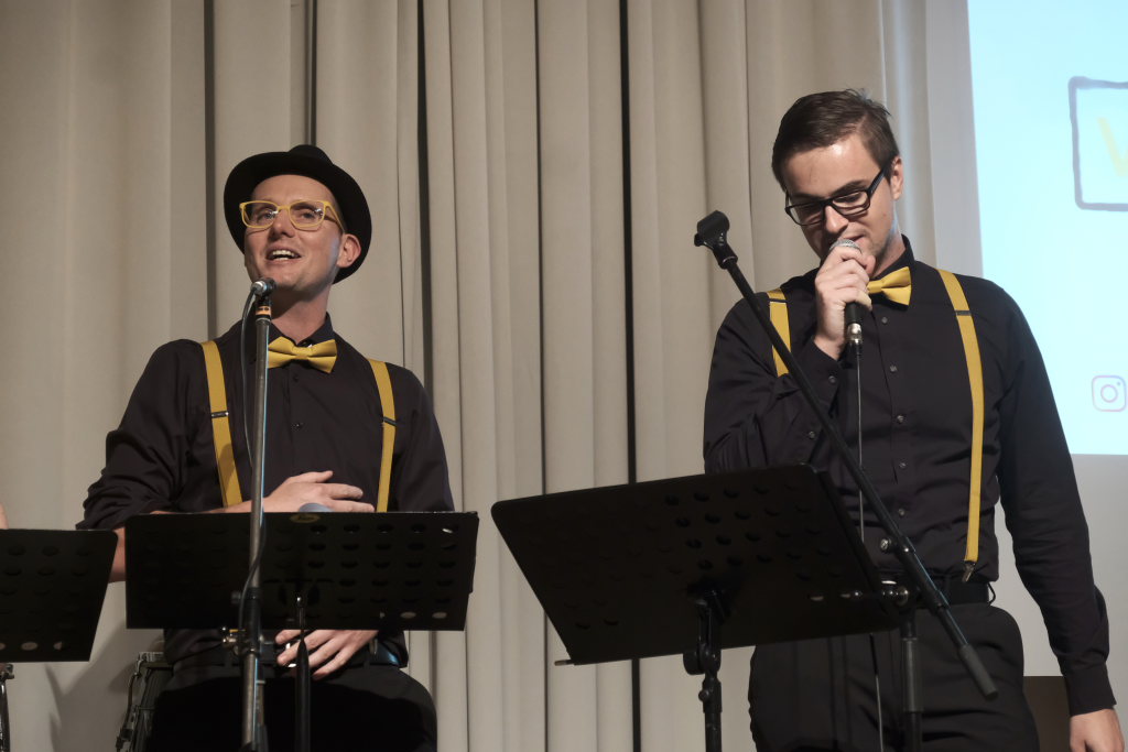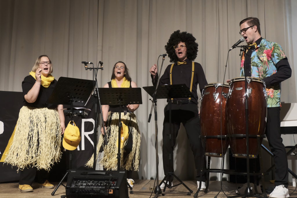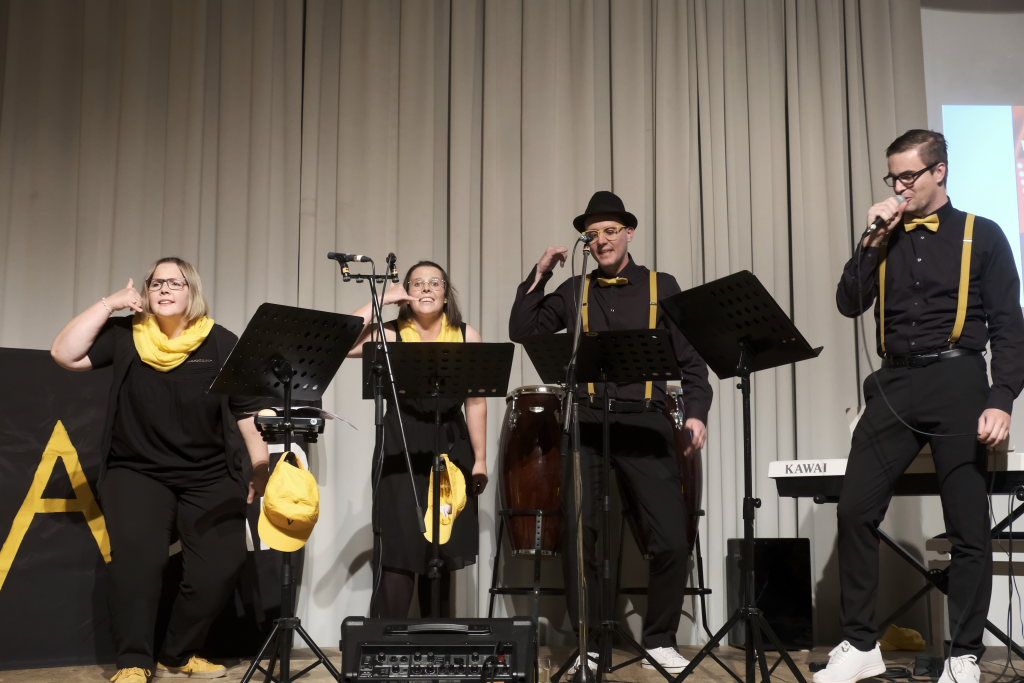 Und so stiegen die Vier mit einem Werbesong-Medley, an dessen Ende sie gleich noch ein Erinnerungs-Selfie anhingen, in ihr Abenteuer ein. Aus dem Hit der Toten-Hosen „Altes Fieber“ wurde bei Vieragsang mit feinsinnigem schwäbischem Humor das Lied der schmerzenden Glieder. Wo ihre musikalischen Wurzeln liegen, zeigten sie bei dem afrikanischen Gospel Mamaliye, begleitet von Klaus Bendel am Cajon. Ihren wunderbaren Humor präsentierten sie dann auch bei ihrer philosophischen Betrachtung darüber, warum englische Titel soviel erfolgreicher sind als deutsche.