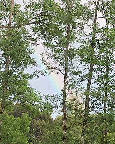 Hinter den Uferbäumen der Hofser Ach zeichnete sich am Samstagabend dieser Regenbogen ab. Abgelichtet von der Rotismühle aus Richtung Legau. Foto: Christine Abele-Aicher.