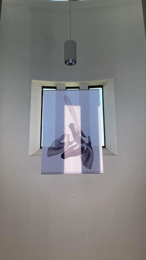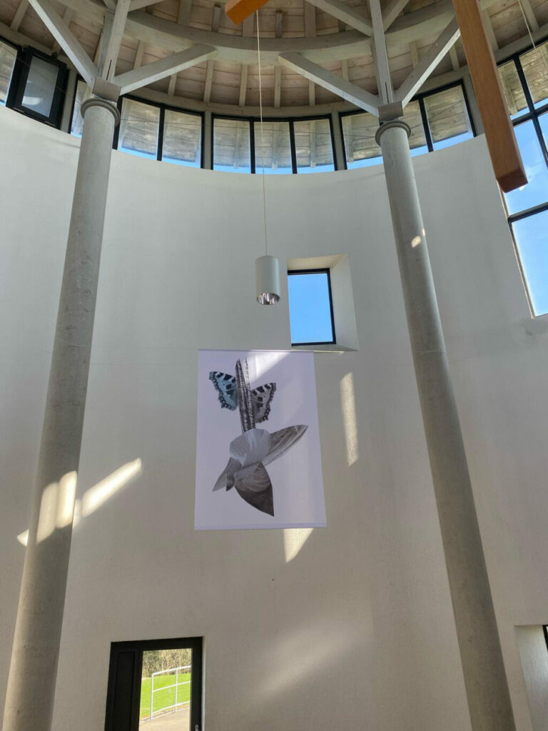 „Acht Collagen, die, auf Stoffbanner gedruckt, im Raum schweben (Bild). Die Motive umspinnen Gedanken zum Menschlichen, insbesondere zum Menschsein in Situationen des Übergangs“ beschreibt Ricarda Wallhäuser ihr Projekt für die Galluskapelle. „Es geht um Augenblicke der Schwere und der Leichtigkeit, das Atmen als immerwährende Wiedererweckung, Hoffnungsfunken in Momenten der Wut und Einsamkeit, sowie um Mitmenschlichkeit. Der Titel spielt auf das Reisen als Übergangsmoment, sowie auf die Galluskapelle als Meditationsort für Reisende an. Ganz besonders steht die Osterzeit für einen Übergang – vom Tod zum Leben, vom Ende zum Neubeginn. Ricarda Wallhäuser ist Künstlerin und Grafik-Designerin mit Wohnsitzen in Leutkirch und Berlin. In ihrer künstlerischen Praxis arbeitet sie mit der Collage, die sie als erzählerisches Medium verwendet, ebenso mit Text. Sie nimmt national und international an Ausstellungen teil und arbeitet in der Lehre.