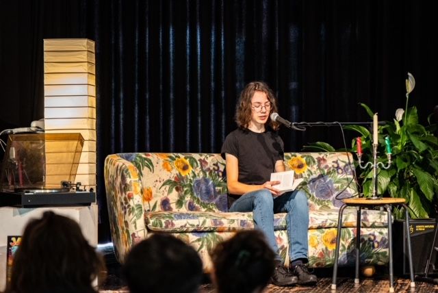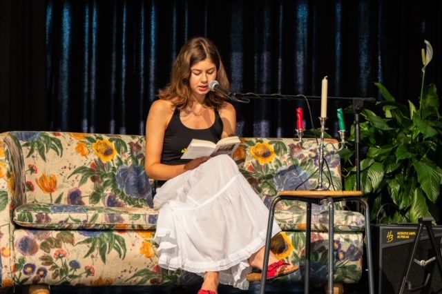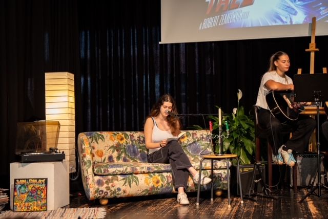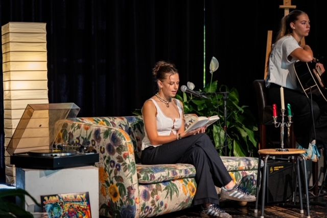 Dass dieses Event mit viel Sorgfalt vorbereitet beziehungsweise erarbeitet wurde, zeigt schon allein ein Blick auf die Bühne. Ein geblümtes Sofa, davor ein Tischchen mit Kerzenständer, ein Stapel Schallplatten auf dem Boden – Flickenteppich, Ikea-Stehlampe und Poster versetzen den Betrachter sofort in die 80er-Jahre. Der Roman „Hard Land“ von Autor Benedict Wells spielt genau in dieser Zeit, in den USA des Jahres 1985.