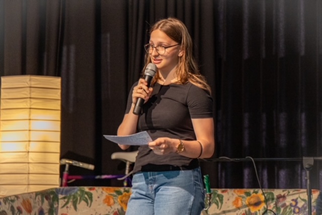 Deutschlehrer Stefan Ammermann blickt zu Beginn der Lesung auf die Entstehungsgeschichte des Projekts mit seiner Klasse zurück. Foto: privat