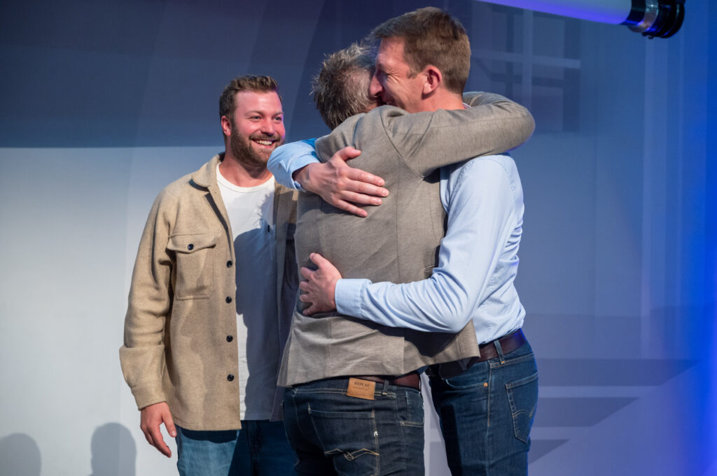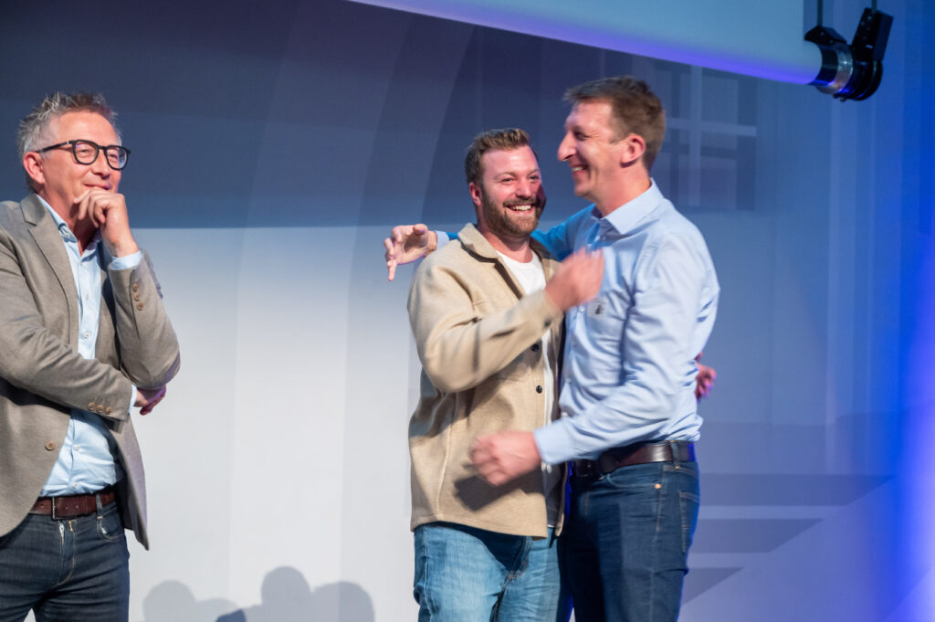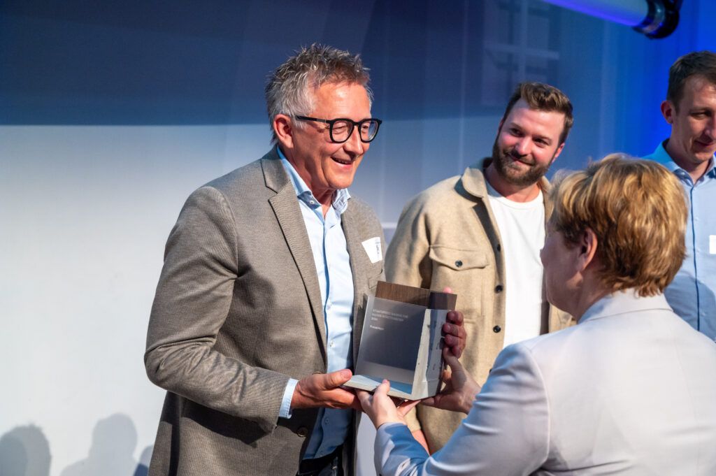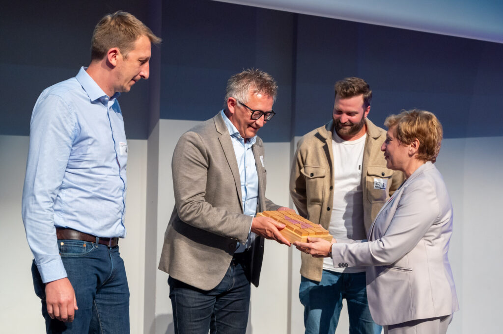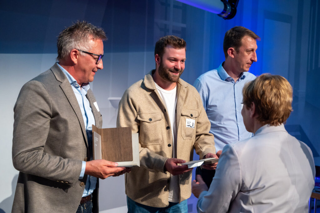 Christian Skrodzki nimmt aus den Händen von Bauministerin Razavi den Staatspreis Baukultur für die Genussmanufaktur in Urlau entgegen. Foto: Martin Stollberg