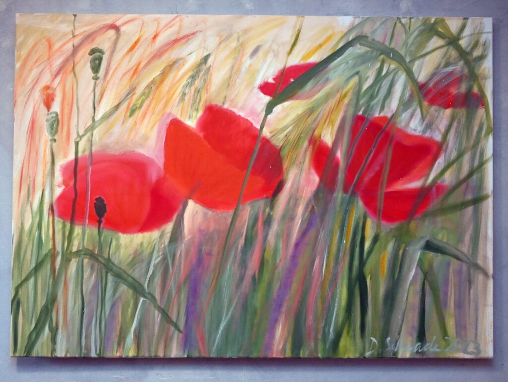 Viele Gemälde Schrades sind zu groß für die heimischen vier Wände. Bei anderen, die vom Format passen könnten, ist der Preis für manchen ein Hindernis. Aber da beweist sich Dorothea Schrade als clevere Geschäftsfrau und bietet Ratenzahlung an. Wie wäre es, mit einem „haltbaren“ Blumenstrauß in Öl auf Leinwand? Bezahlen können Sie noch im nächsten Jahr.