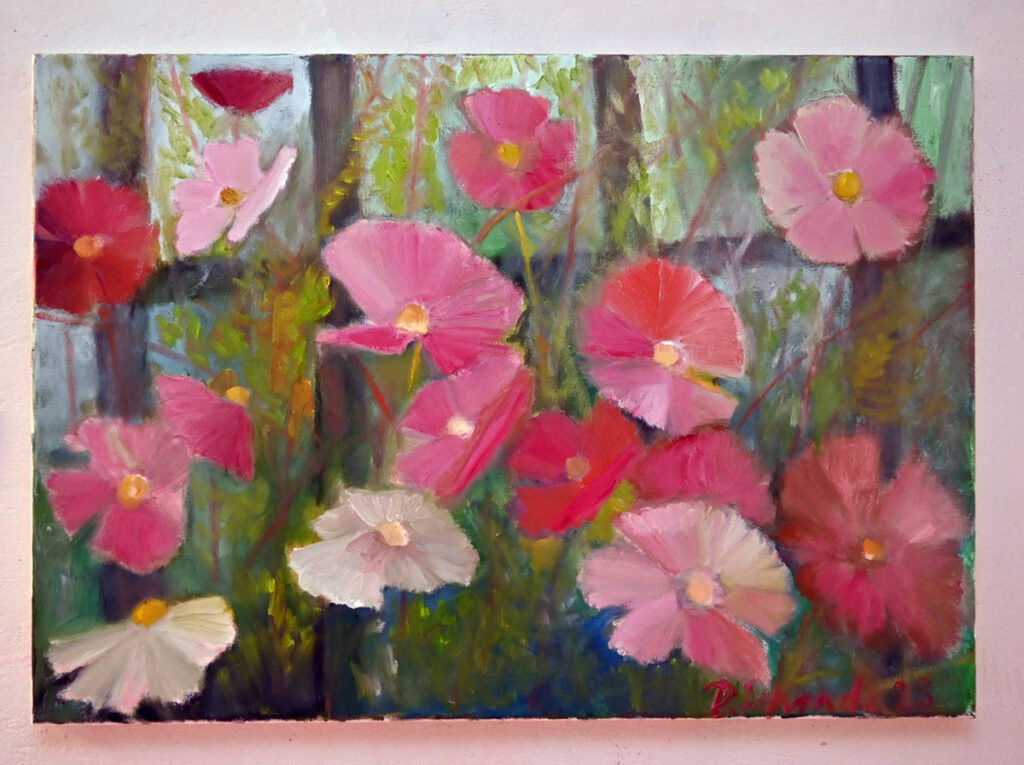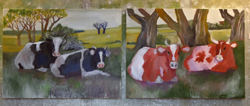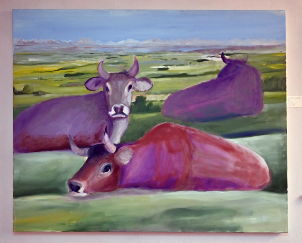 Das Alte Pfarrhaus, in das man zur Vernissage geladen war, ist ein überaus passender Hort für Schrades Gemälde. Bleiben wir bei Härings Worten: Eine Blüte ist ein Erlebnis. Dorothea Schrade gönnte ihren Besuchern viele Erlebnisse. Vom roten Klatschmohn über Ansichten aus ihrem Garten bis zum Blumenkasten am Fenster. Dorothea Schrade malt mit kräftigem, sicheren Duktus und bringt dem Betrachter in den alltäglichen Motiven das Erlebnis Natur vor die Augen. Beeindruckend auch die großformatigen Bilder von Kühen. Eine für das Allgäu typische Ansicht, der man überall begegnet. Grasende Kühe, liegende Kühe, Dorothea Schrade findet im Alltäglichen das Besondere.