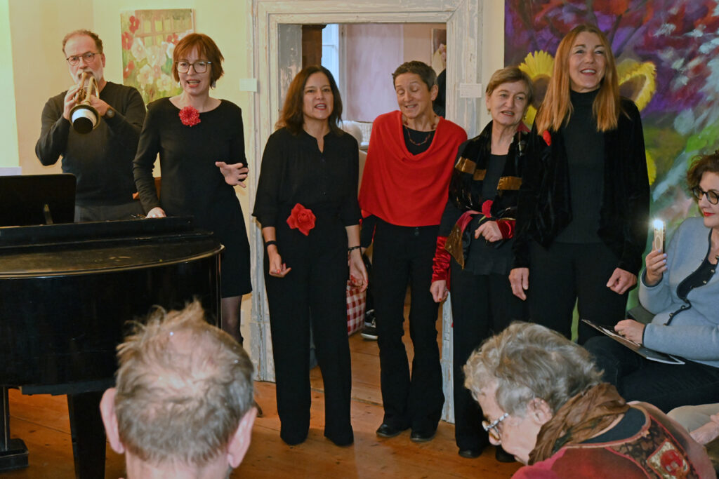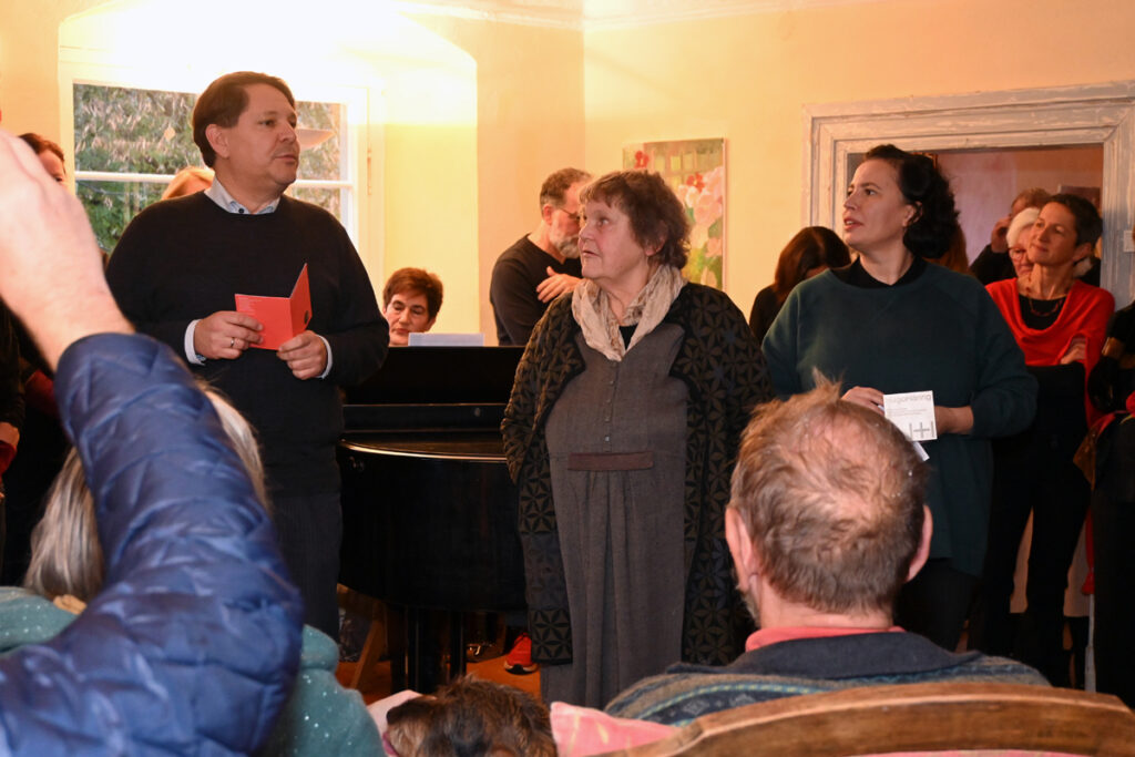 Der Frauenchor aus Bergatreute verzauberte die Zuschauerinnen grade noch mit Hildegard Knefs „Roten Rosen“, Dorothea Schrade begrüßte ihre Gäste, als Sohn Tobias mit seiner Frau Martha Strilic in die Gesellschaft platzte. „Meine Mutter hatte ja keine Zeit, deshalb mussten wir den Preis stellvertretend entgegennehmen.“ Verliehen wurde der Preis vom BDA Bund deutscher Architektinnen und Architekten Baden-Württemberg, Gruppe Bodensee, für das Strohballen-Atelier, das Dotothea Schrade als Bauherrin mit dem Architekturbüro Hochstrasser errichtete.