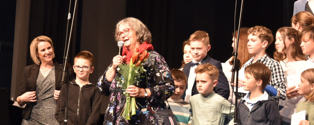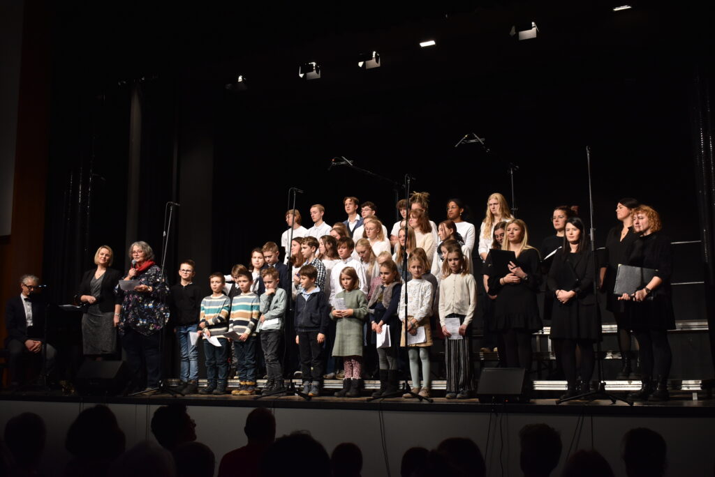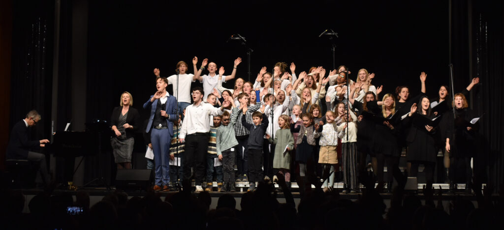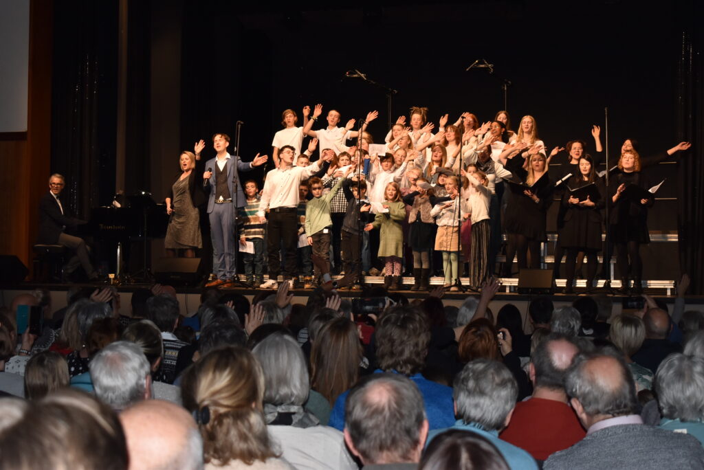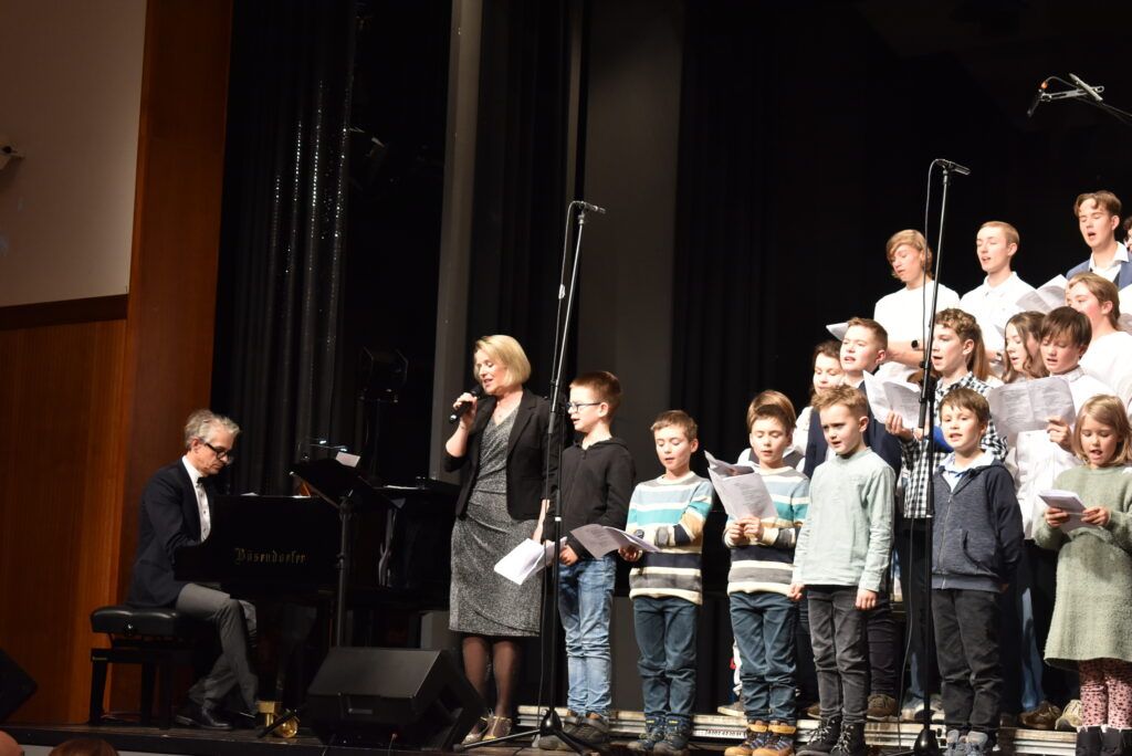 Als Höhepunkt erklang der bekannte Song von Michael Jackson „Heal the world“, zu dem zwei jugendliche Solisten hervortraten. Alle Chöre sangen mit und nicht wenige Zuhörer summten das Lied, das Gänsehaut macht. Sehr lange wurde geklatscht für all die tollen Sänger/innen mit Solistin und dem „Mann am Klavier“. Brigitte Göser überreichte Geschenke, dankte allen Mitwirkenden, dem Publikum und erklärte, wofür die Spenden vorgesehen sind: zur Hälfte für den Kinder- und Jugendchor, zur Hälfte für die Caritas, um Familien, die in Not geraten sind, zu unterstützen.