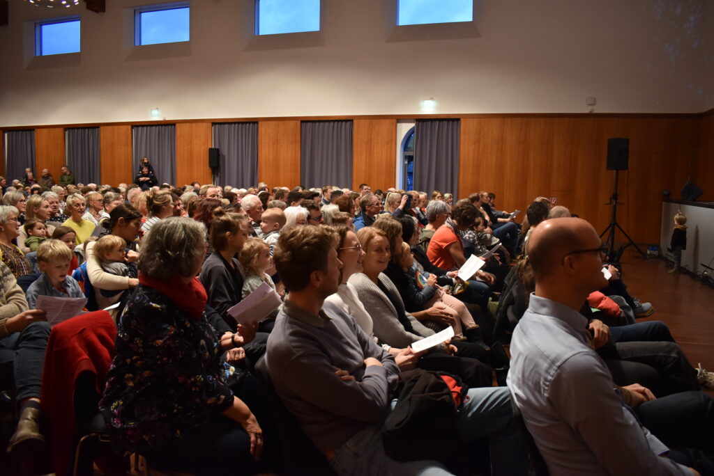 Leutkirch – Am 4. Adventssonntag lud die Chorgemeinschaft St. Martin in Leutkirch zu einem Familien-Mitsing-Konzertnachmittag ein, genannt „Coming home for christmas“. Die Festhalle füllte sich derart schnell, dass bald weitere Stühle aufgestellt werden mussten; an den Seiten standen die Besucher. Unter Beifall kamen erst die jüngsten Sänger/innen auf die Bühne, die „Martinsspatzen“; dann kamen der Jugendchor sowie die jungen Frauen des „Ensembles Vocal“ und stellten sich nebeneinander auf. Solosängerin Gertrud Hiemer-Haslach und Franz Günthner am Flügel komplettierten den Reigen der Auftretenden.