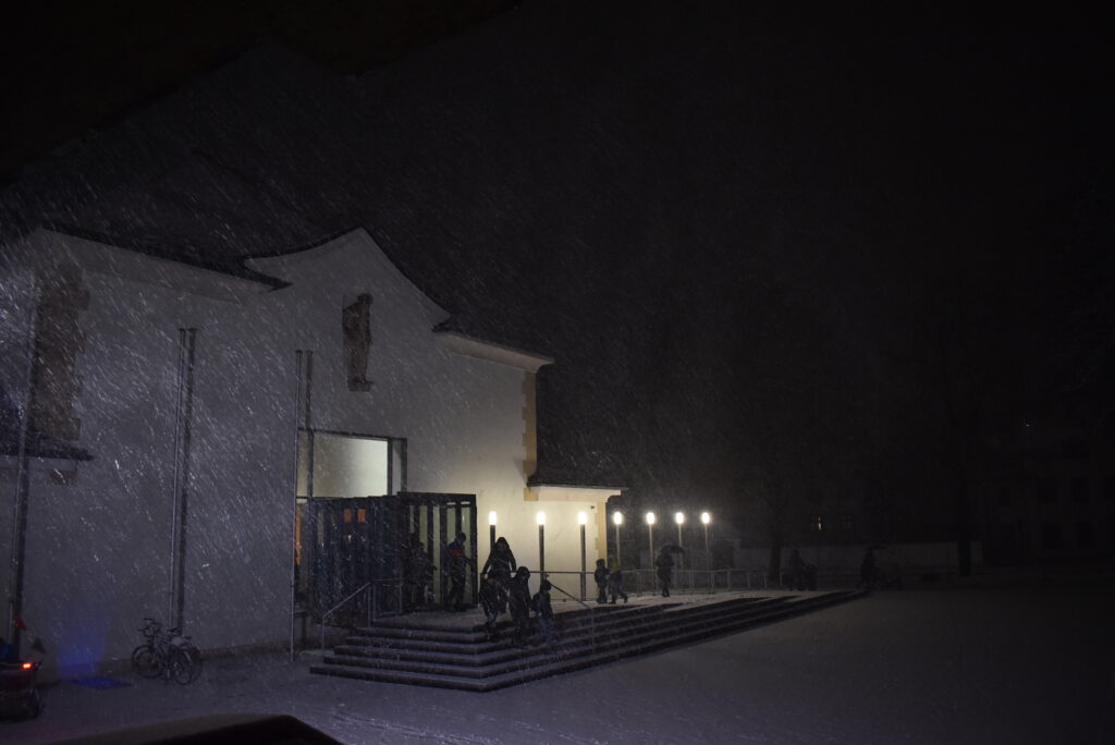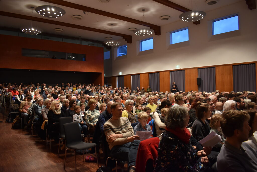 Zum Schluss erklang aus Hunderten von Kehlen „Fröhliche Weihnacht überall“ und mit weihnachtlicher Musik im Ohr ging es hinaus in die Winternacht mit Schneefall. Zum einen überrascht, zum anderen erfreut, dass es genau zu Weihnachten doch noch weiß wurde, stapfte oder radelte man vorsichtig nach Hause. So mancher dachte wohl: „Dieser Schneefall wurde im Konzert herbeigesungen.“