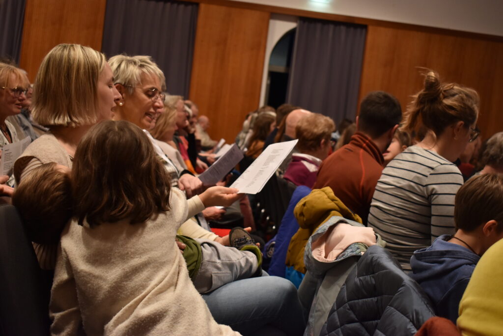 Dann stellten sich die jungen „Martinsspatzen“ musikalisch vor und zeigten ihr Können bei frisch-fröhlichen Liedern. Ebenso tat es der gemischte Jugendchor mit kräftigen Stimmen und gut einstudierten Liedern. Franz Günthner führte durchs Programm und lud zu einem zweiten Medley ein, die Texte lagen aus. Dem Publikum machte das Singen sichtlich Spaß, so dass der gewitzte KMD schon bald ein großes Potential sah und zu den Proben 2025 der verschiedenen Kantorei-Chöre einlud.