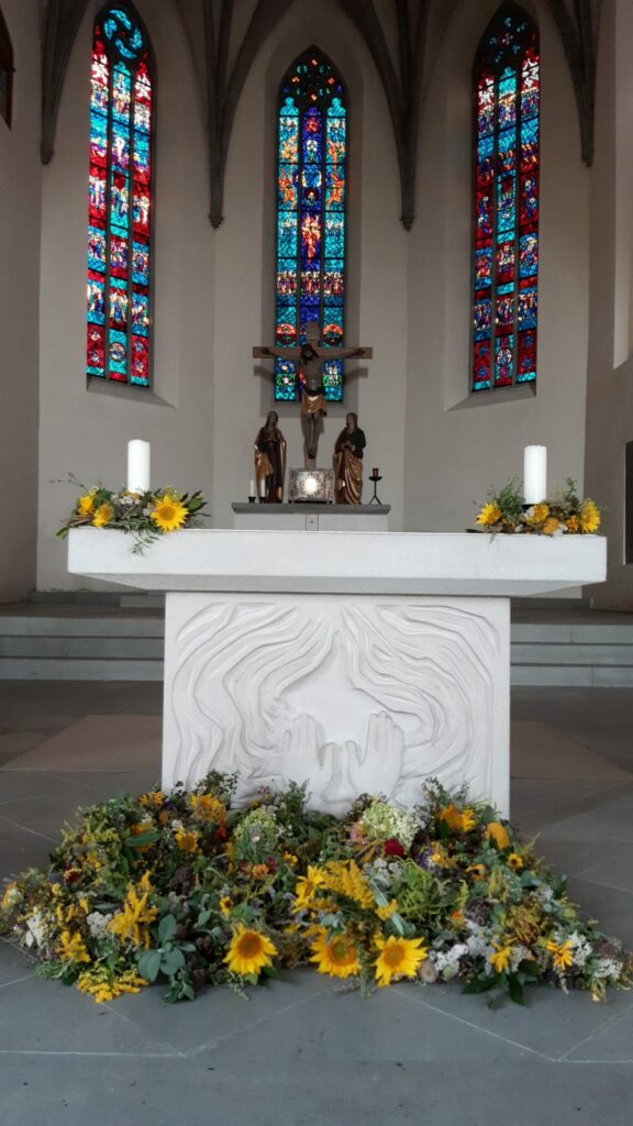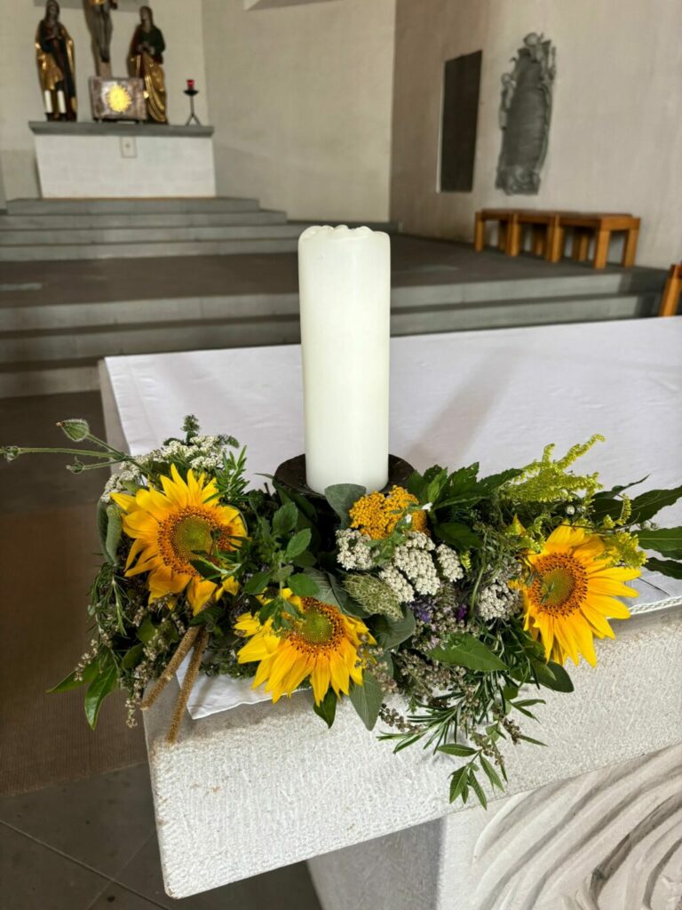 Leutkirch – Viele fleißige Hände des Katholischen Frauenbunds Leutkirch haben am 15. August sortiert, geschnitten und gestaltet, um mehr als 100 Kräuterbüschel zu binden. Die rund 15 Frauen hatten vom Garten oder Wald etliche Kräuter und Heilpflanzen mitgebracht, auch Sonnen- und Ringelblumen. So entstanden viele bunte Kräutersträuße, kleine und große. Sie wurden alle vor und um den Altar in St. Martin gelegt, es duftete herrlich.