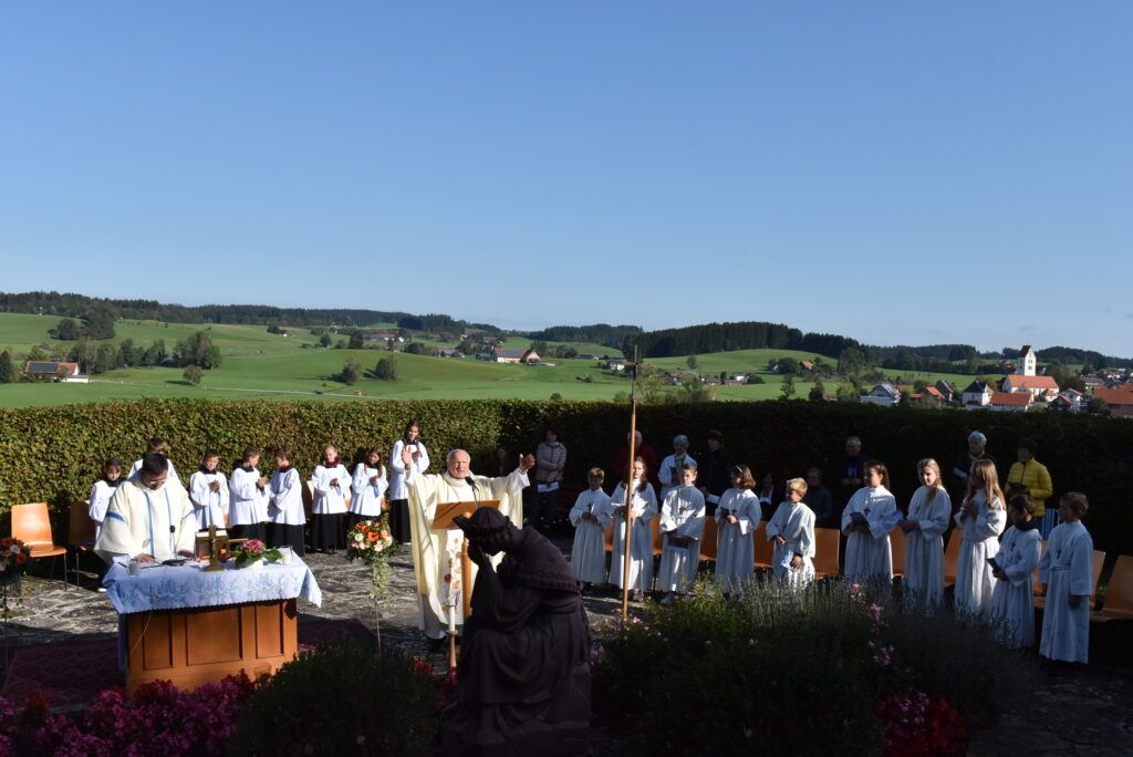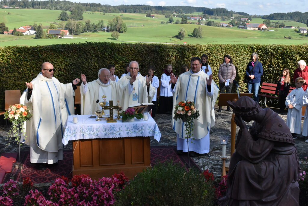 Hier fand der Festgottesdienst statt, den Dekan a.D. Heinz Leuze aus Ravensburg und die Pfarrer Elmar Schneider, Pilgerpfarrer Robert Gubala sowie Pfarrer Robert Sliwa zusammen feierten. Dekan Leuze hat eine tiefe Verbindung zur Region, ging er doch aus dem damaligen Knabenseminar in Leutkirch (jetzt Regina Pacis) als erster Priester hervor, mit Weihe im Jahr 1972. „Wir Buben liefen jedes Jahr einmal von Leutkirch zur La Salette Kapelle und später habe ich hier auch den Pfarrer Hieber aus Merazhofen persönlich kennengelernt“, erinnerte sich der Dekan a.D.