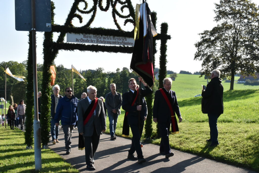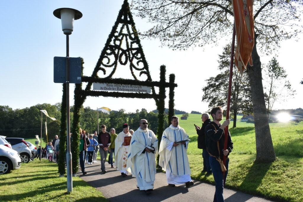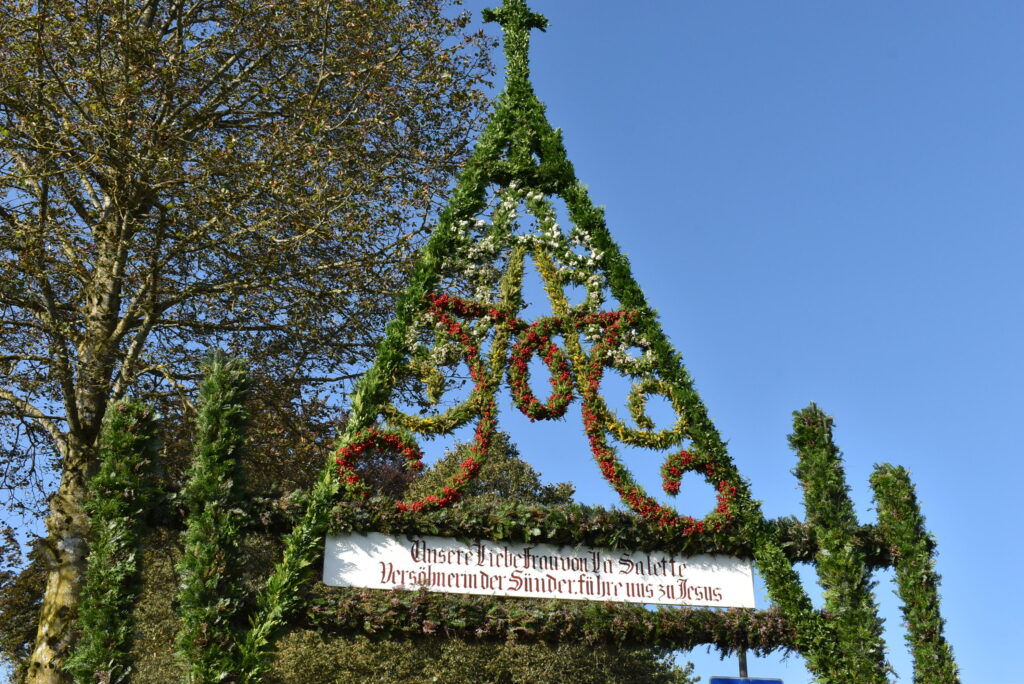 Engerazhofen – Frauen haben einen wunderschönen Blumen-Torbogen gestaltet. Das diesjährige Kapellenfest war geprägt von herrlichem Wetter und so konnte die traditionelle Prozession von der Kirche in Engerazhofen hinauf auf den Fuchsberg zur La Salette Kapelle bei Sonnenschein stattfinden.
