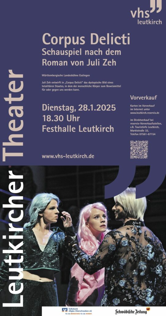 Eine zweite Kulturveranstaltung im Januar findet am Dienstag, 28. Januar statt, wenn die Württembergische Landesbühne Esslingen mit einer Dramatisierung des Romans von Juli Zeh „Corpus delicti“ zu Gast sein wird. Beginn ist dann bereits um 18.30 Uhr in der Festhalle.