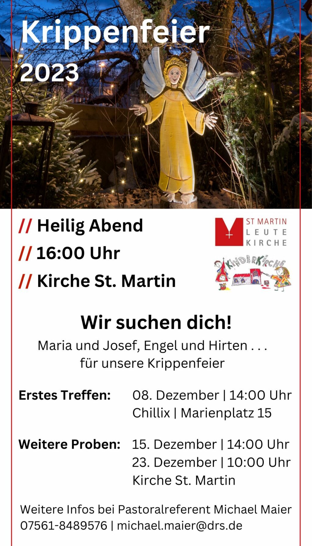 Für das Krippenspiel werden noch Kinder gesucht, die mitspielen wollen: Maria, Josef, Engel und Hirten. Es gibt Sprechrollen und Rollen, bei denen nichts gesprochen werden muss. Bereits Kindergartenkinder können mitspielen. Ein erstes Treffen findet am Freitag, 8.Dezember, um 14.00 Uhr im Chillix statt. Weitere Informationen erhalten Sie bei Pastoralreferent Michael Maier (Tel. 8489576, michael.maier@drs.de).