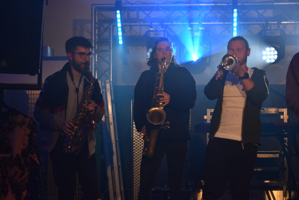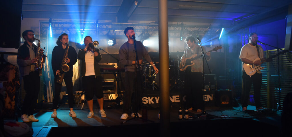 Und es gab ordentlich was auf die Ohren. „Alles dreht sich“ sang die Nürnberger Gruppe „Skyline Green“ (Bild) in einem der Säle im Brauhaus. Sie brachte dabei allerhand Rohre zum Tönen – geblasen von Saxophonistin Anne Brand. Mal schmetterte die fest-freudige Franken-Combo schnell tanzbare Blasmusik wie auf einer Balkan-Party. Mal erklang hitzig Latin-Rock. Mal kamen ihre Lieder im Ska – also irgendwo zwischen Reggae für Holzfäller und Tango für Transportarbeiter. Das Publikum im dicht gedrängt nebligen Saal spendete heftig Applaus.