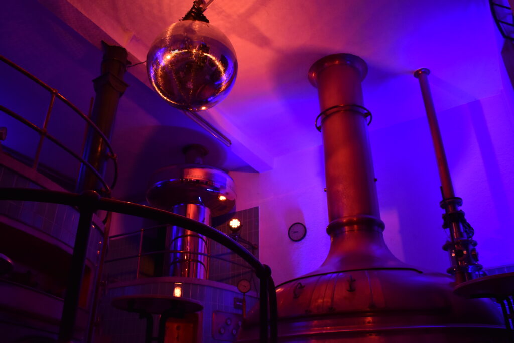 Neben der Bühne arbeitete in dieser Nacht der automatisch arbeitende Kommissionier-Roboter. Im Maschinen-Takt hievte er bunt beleuchtet Getränke-Kästen auf Paletten (Bild). Moderne Zeiten 2024 im alt-ehrwürdigen Brau-Tempel von 1897. Bewährte Vergangenheit und wirtschaftliche Zukunft.