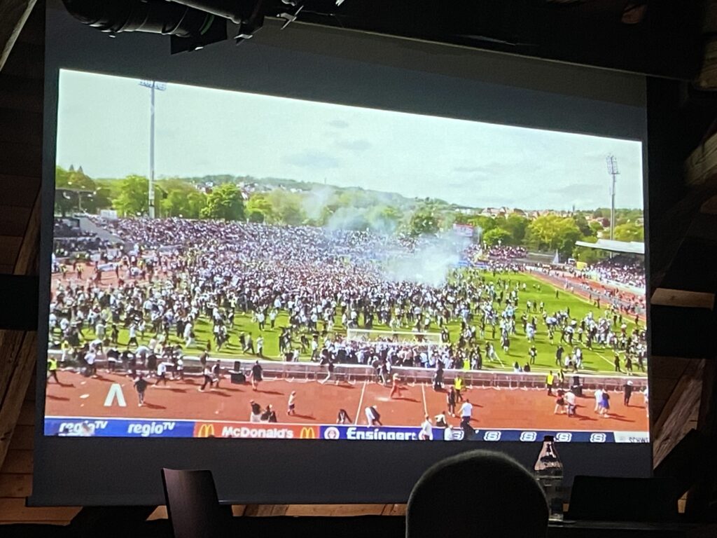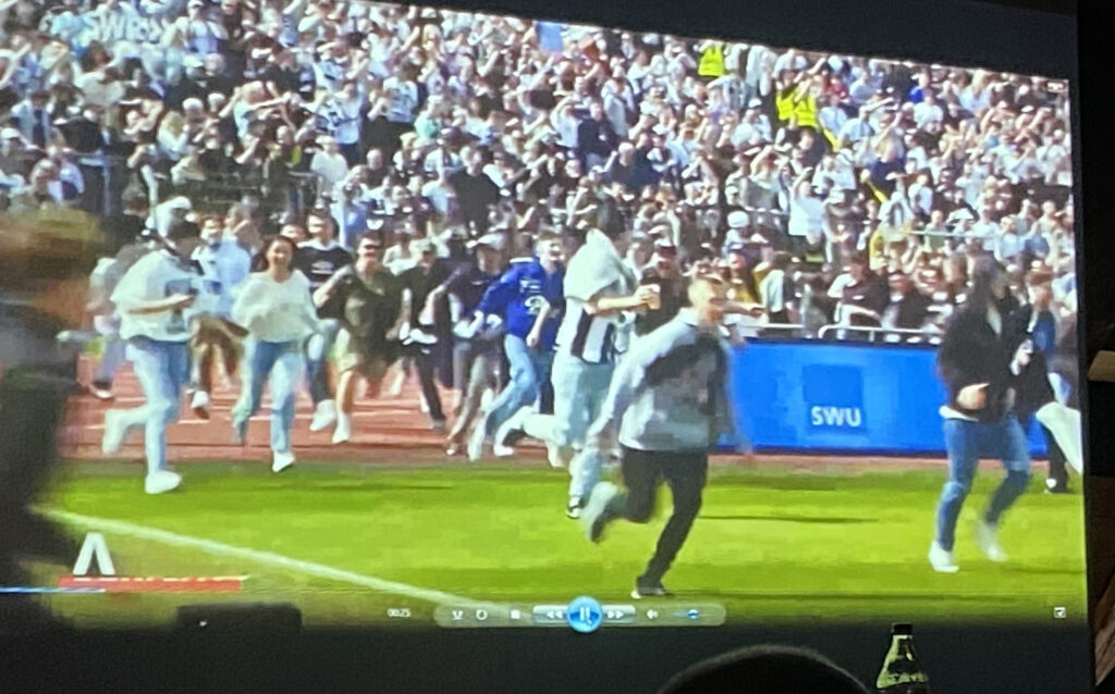 4. April 2024: Aufstiegsjubel in Ulm. Der SSV ist in der Zweiten Liga angekommen! Als Aufsteiger in die Dritte Liga wurde der SSV dort sofort Meister – ein Husarenstück, das es nicht oft gibt. Zwischendurch war der ehemalige Erstligist SSV Ulm in die Fünfte Liga abgesackt gewesen. Beim Gespräch mit SSV-Geschäftsführer Markus Thiele wurden diese Jubelbilder eingeblendet.