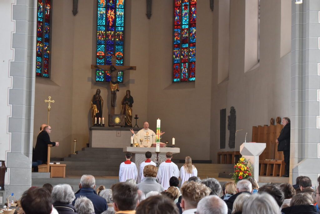 Nach der stimmungsvollen Eröffnung durch die Stadtkapelle sprach Pfarrer Karl Erzberger von der Hoffnung durch den auferstandenen Christus, von der Freude an der Musik und an der Frühlingssonne, die genau zum Beginn der Messe den Kirchenraum durchflutete. Die Kantorei ließ dann gleich zum Kyrie und Gloria der Missa Katharina ihr ganzes Stimmenpotential erklingen, begleitet durch die Musiker in sehr harmonischer Weise. „Das ist der Tag, den der Herr gemacht – Halleluja“, sprach Erzberger und verlas das Evangelium der Auferstehung, die durch das leere Grab versinnbildlicht ist. In seiner Predigt fragte der Stadtpfarrer nach dem Engel, der den anwesenden Gläubigen die Augen und Ohren öffnen könne. Man möge die neue Osterkerze betrachten mit ihren Alpha- und Omega-Buchstaben, Christus sei Anfang und Ende und er sei uns vorausgegangen.