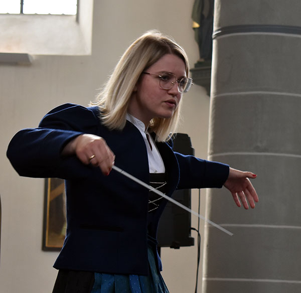 Der Chor auf einem Podest im neuen Kirchenraum hinter den Gottesdienstbesuchern, die Stadtkapelle vor und seitlich von den Sänger/innen, so konnten sich die schönen Melodien in der ganzen Kirche voll entfalten. Sehr bewundernswert war die spontane Zusage der Solistin Tatjana Göppel (Bild), die am frühen Sonntagmorgen für die erkrankte Sängerin Gertrud Hiemer-Haslach einsprang. Die Nichte von Hiemer-Haslach erarbeitete sich in kürzester Zeit die Solo-Parts in Lateinisch.