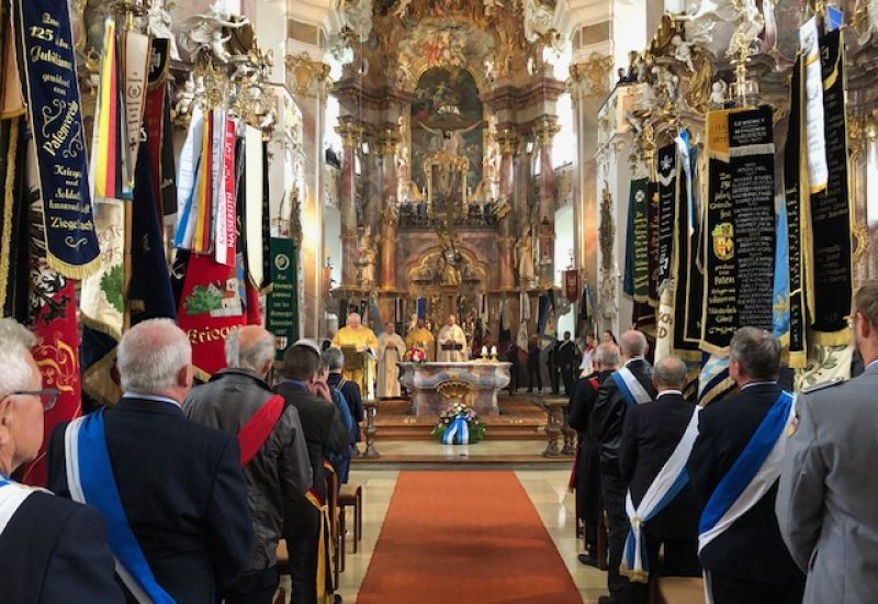 Maria Steinbach – Eine lange Autoschlange vor dem Wallfahrtsort. Und dann eine rappelvolle Kirche. Michaeliswallfahrt von rund 80 Krieger- und Kameradschaftsvereinen in Maria-Steinbach. Mit Blaskapellen und Dutzenden beeindruckender Fahnen. Und mit einer Predigt von Weihbischof Matthäus Karrer (Rottenburg-Stuttgart). Danach Kranzniederlegung durch Bayerns Gesundheitsminister Klaus Holetschek (CSU). Während der Kirchenmann darauf hinwies, dass eine „Zeitenwende“ auch bedeuten könne, sich der Lie…