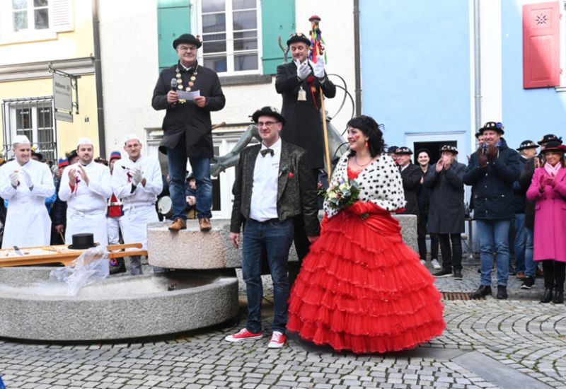 Bad Waldsee – Michaela und Sascha Scheerer gaben sich am Elften Elften, dem Fasnetsauftakt in Bad Waldsee, im Rathaus das Jawort. Danach zogen die frisch vermählten und dem närrischen Brauchtum sehr gewogenen Eheleute zur Hochstatt, wo traditionell am Elften Elften der Fasnetsauftakt begangen wurde. Dort gratulierten Zunftmeister Roland Haag, Fasnetslader Ralph Zell, OB Matthias Henne, Bürgermeisterin Monika Ludy, der Elferrat, die Sammlermusik, die Bäckergesellen und alle 550 Zuschauer am Narr…