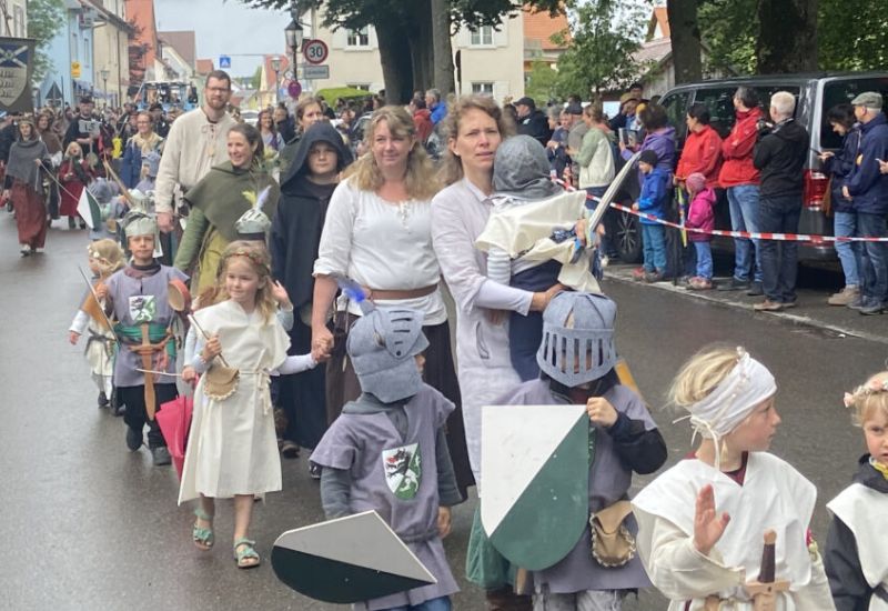 Kißlegg (rei) – Die viertägigen Feierlichkeiten zum 1200-jährigen Ortsjubiläum Kißleggs haben am 30. Mai (Fronleichnam) begonnen. Am Nachmittag war der Mkittelalter-Umzug. Viele Festwagen und Motivgruppen erfreuten das zahlreich am Wegesrand versammelte Publikum. Das Wetter war entgegen den Prognosen überraschend gut. Es hielt während des Umzuges. Kaum war der vorbei und die rettenden Zelte erreicht, kam das Nass vom Himmel. Das tat aber der Festesfreude der im Schlosspark Versammelten keinen A…