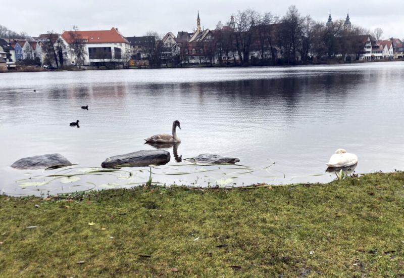 Bad Waldsee – Das „Wappentier“ des Stadtsees hat, hoffentlich, seine Heimat wieder gefunden. Nachdem drei Schwäne, zwei ausgewachsene, weiß befiederte und ein noch grau befiederter Jungschwan lange Zeit zwischen Stadt- und Schlosssee und den dazwischen liegenden Anlagen umhergewandert waren, scheinen sich zumindest zwei davon im Stadtsee wieder wohlzufühlen. Das Foto hat Erwin Linder gestern (9.12.) beim Spaziergang um den See geschossen.