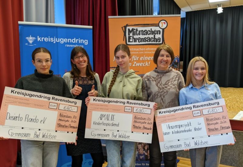 Bad Waldsee – Am Gymnasium Bad Waldsee finden regelmäßig Charity-Veranstaltungen statt, deren Erlöse an drei Partnerprojekte gehen. Bei der Aktion „Mitmachen Ehrensache“ konnten zuletzt stolze 2040 Euro erwirtschaftet werden, welche am 18. März der Schule im feierlichen Rahmen als Schecks überreicht wurden. Das bei „Mitmachen Ehrensache“ geht an Jugendliche in der Region und in Lateinamerika.