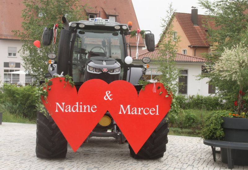 Bad Wurzach – Es war eine richtige Musikantenhochzeit, die da an diesem extrem heißen Samstagnachmittag in und danach vor St. Verena stattfand. Aber nicht nur das: Zu Ehren der Brautleute Nadine Riss und Marcel Jäger fuhren auf dem Klosterplatz ganz große Gefährte auf.