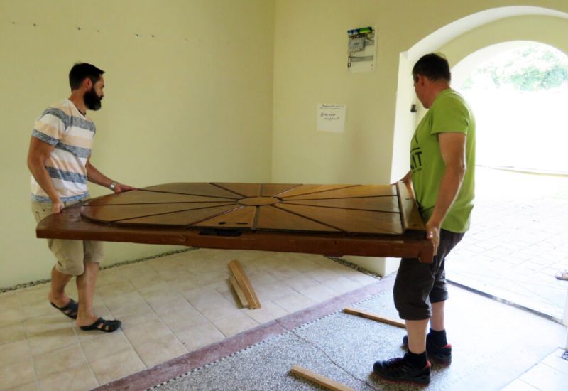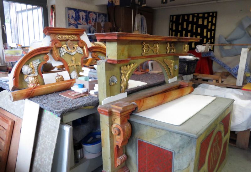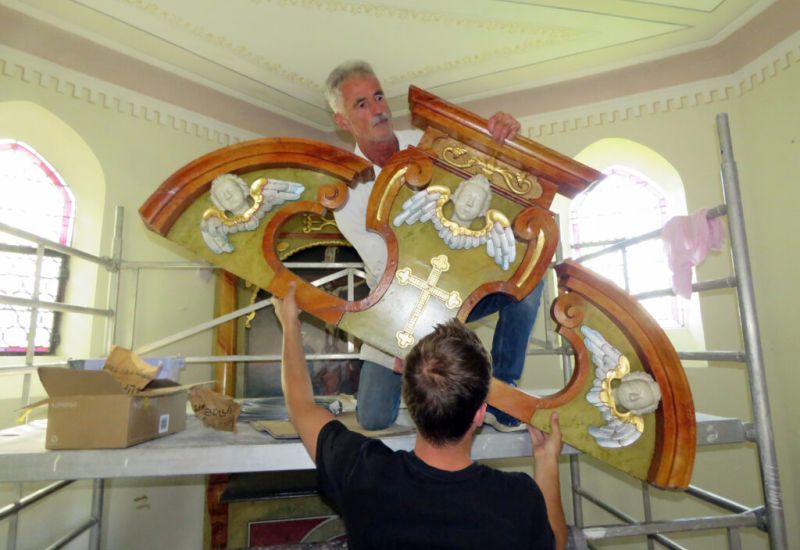 Brugg (rei) – Der in Teilen von 1722 stammende Brugger Altar ist wieder an seinem angestammten Platz: Am 9. August hat Restaurator Erwin Roth ihn in der Rochus-Kapelle in Brugg wieder aufgebaut (zusammen mit seinem Helfer Jürgen). Hergerichtet worden war der Altar in Roths Atelier in Ausnang.