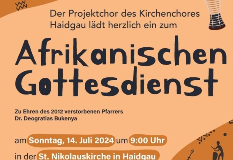 Haidgau – Der Projektchor des Kirchenchors Haidgau lädt herzlich zum afrikanischen Gottesdienst zu Ehren des 2012 verstorbenen Pfarrers Dr. Deogratias Bukenya ein. Am Sonntag, 14. Juli, um 9.00 Uhr in der St. Nikolauskirche in Haidgau kommt die Messe „Missa Africana“ unter der Leitung von Vera Schodlok zur Aufführung.